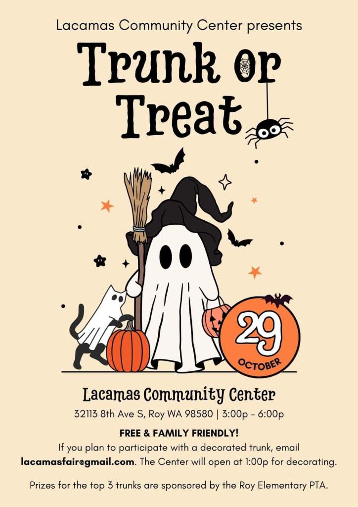 Lacamas Community Center, 32113 8th Ave S, Roy, WA, Trunk or Treat, October 29, 2023, 3:00 p.m. to 6:00 p.m. Come enjoy a safe, family friendly event, put on by your local community center. FREE FREE FREE, Big parking lot and inside buildings in case of bad weather. Information on Facebook
