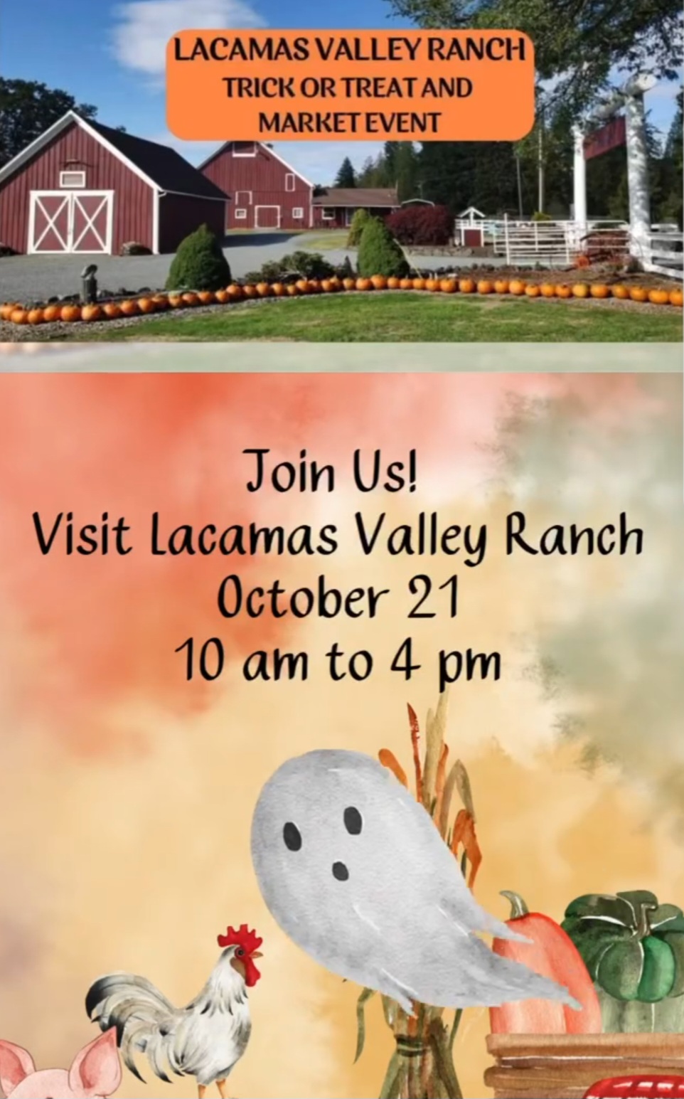 Lacamas Valley Ranch, 3902 288th St S, Roy, WA, October 21, 2023, 10 a.m. to 4 p.m. Lacamas Valley Ranch Trick or Treat & Market Event. Please Share & Visit Our Ranch on October 21st. Please bring cash due to poor Internet service area. We Have Vendors, Food Trucks, a Coffee Truck, Pumpkins for Sale, Baby Animals ❤️🐷 & More. A Minimum of a $5 Donation Per Person at Entry. Kids Under 2 Are Free. Information on Facebook.