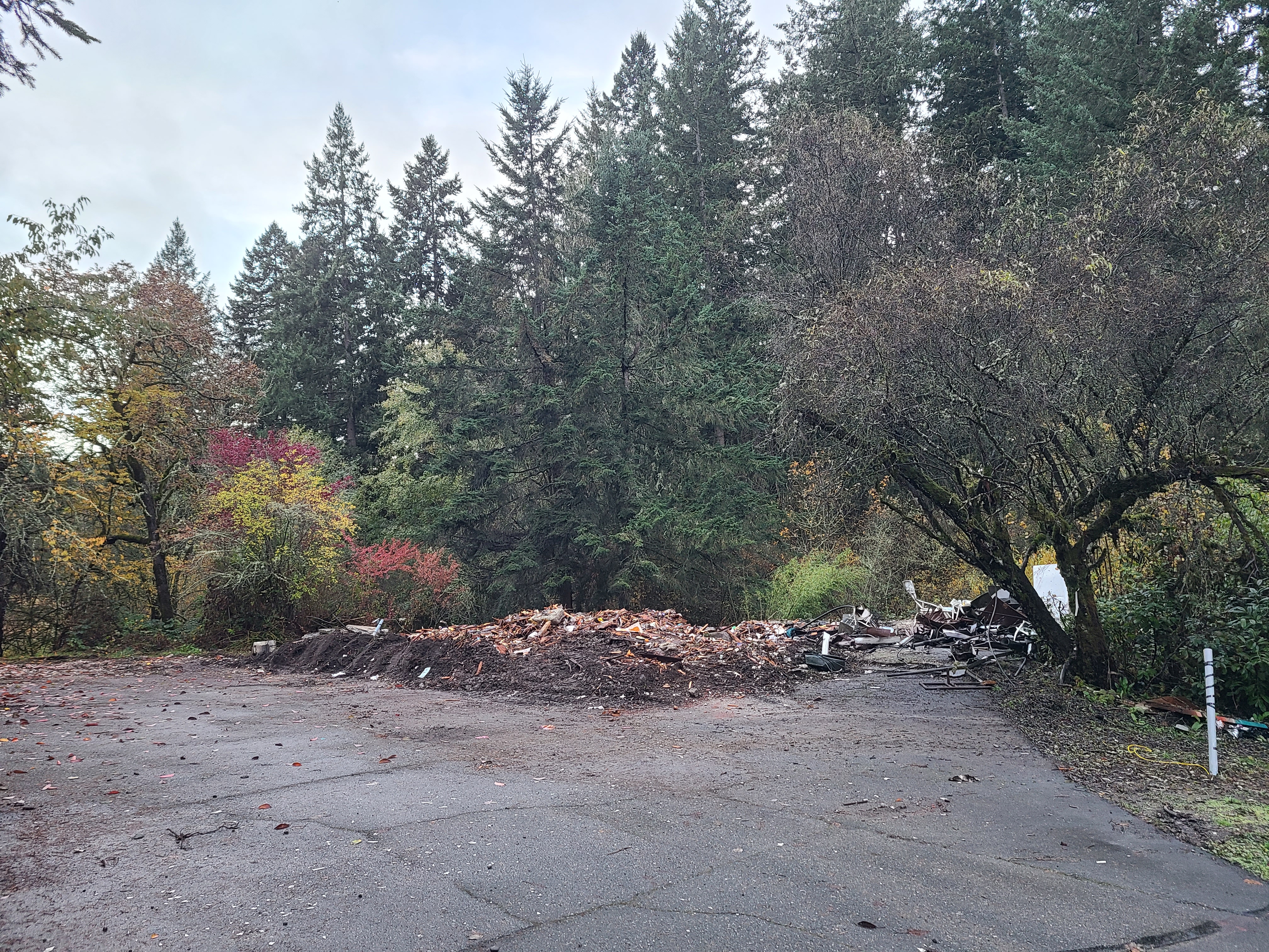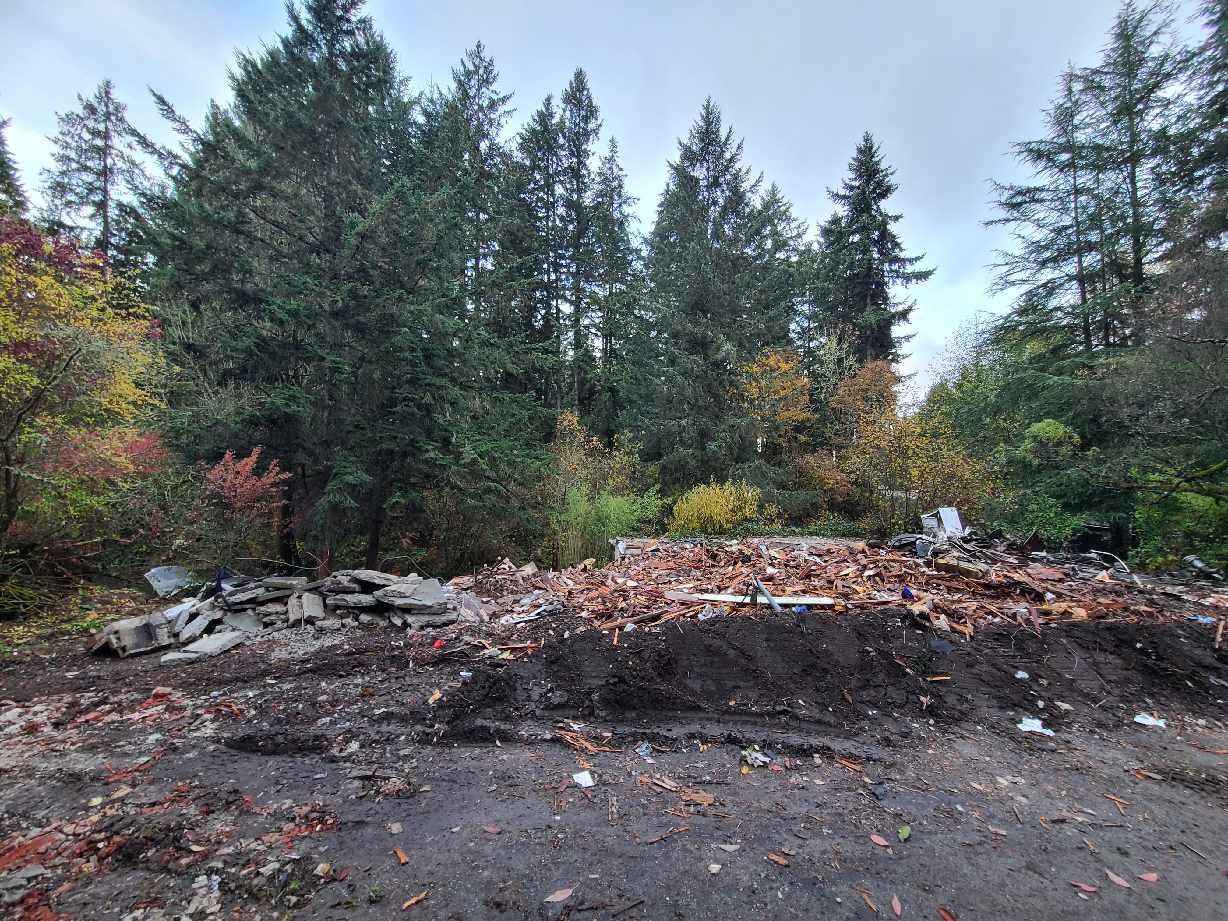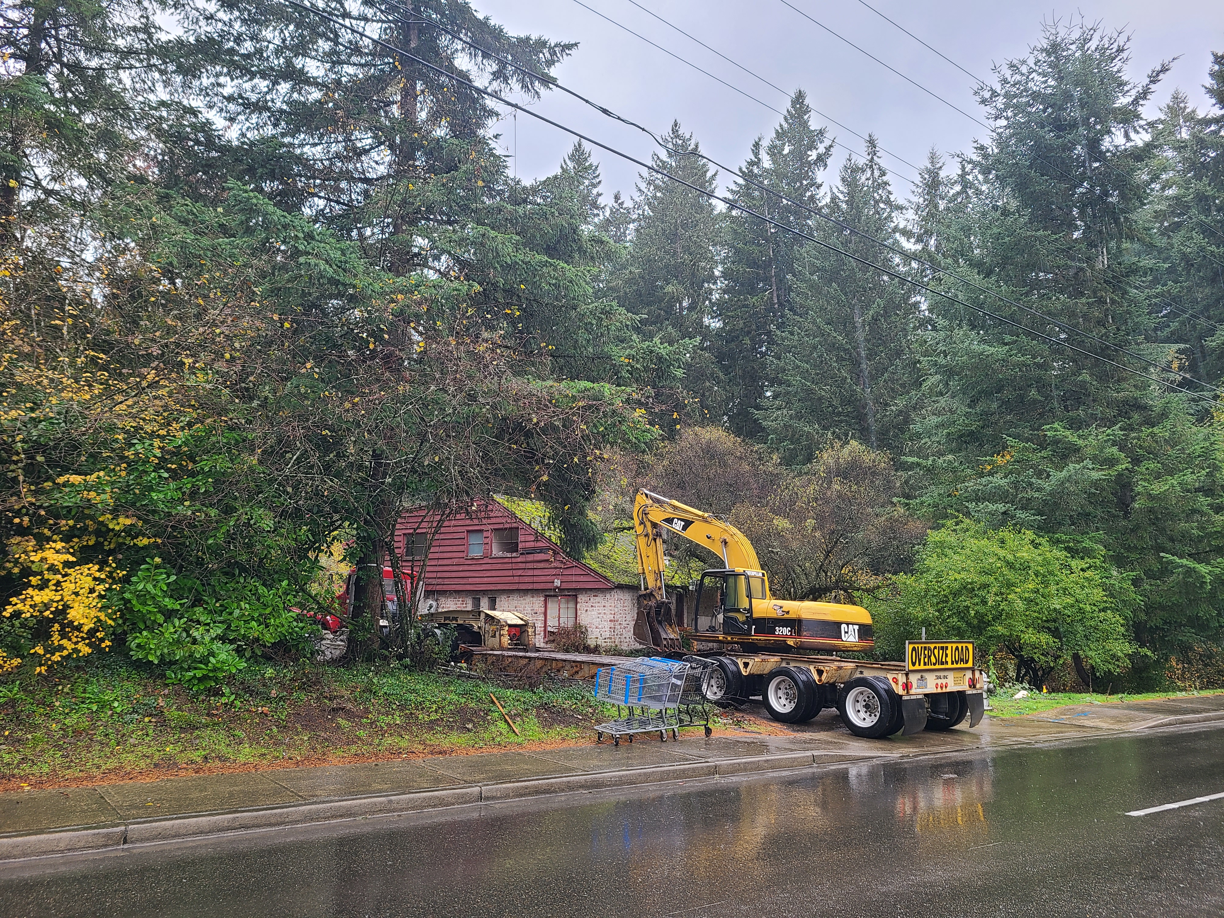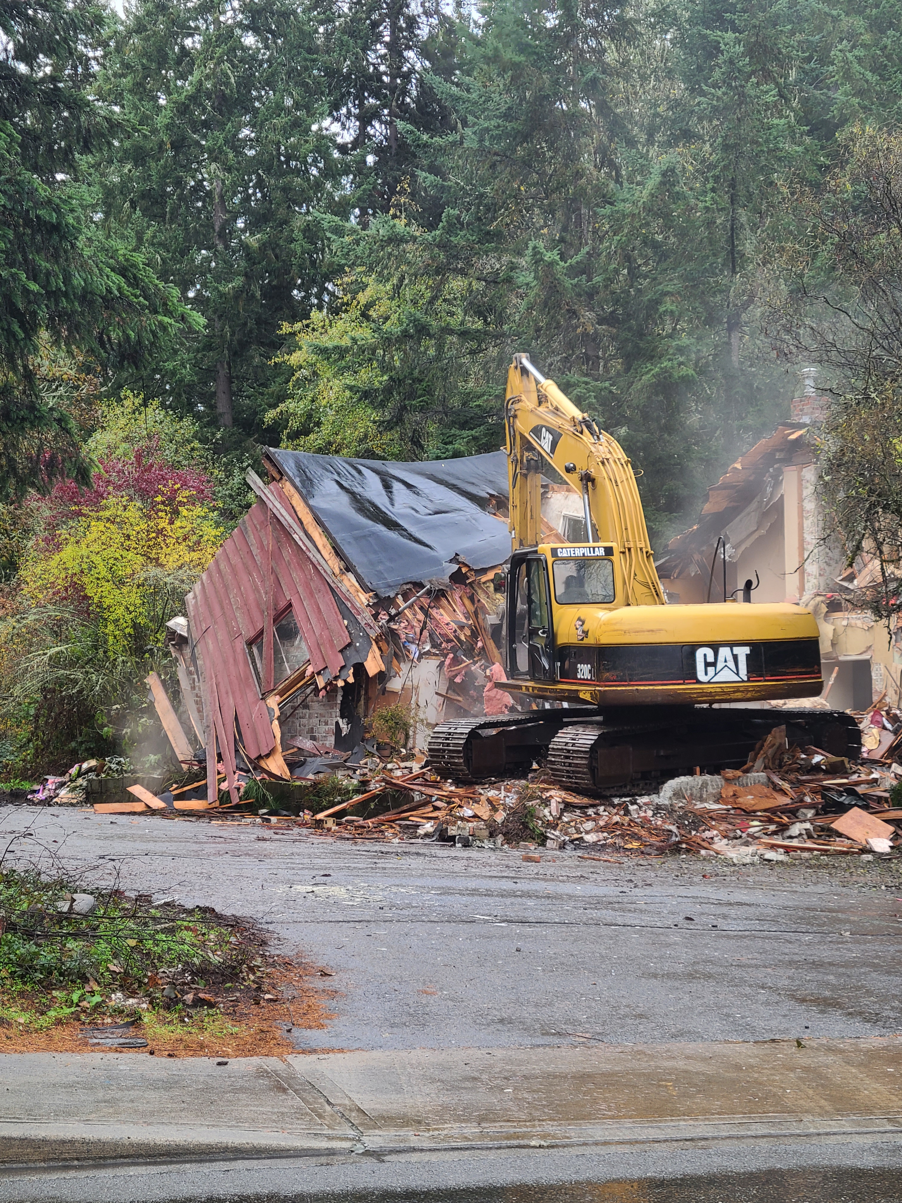 Now, just yesterday, Monday, November 6, 2023, a contractor was out on the former Mosier property demolishing the house. (17320 Spanaway Loop Road) Neighbors stopped for photos. I was forwarded the photos, then went there myself to see and take a few. There was definitely no sign of a silt fence to protect the Spanaway Creek (Coffee Creek) from any stray material falling into it.