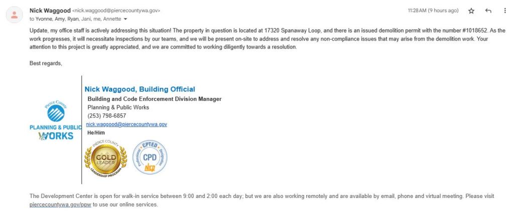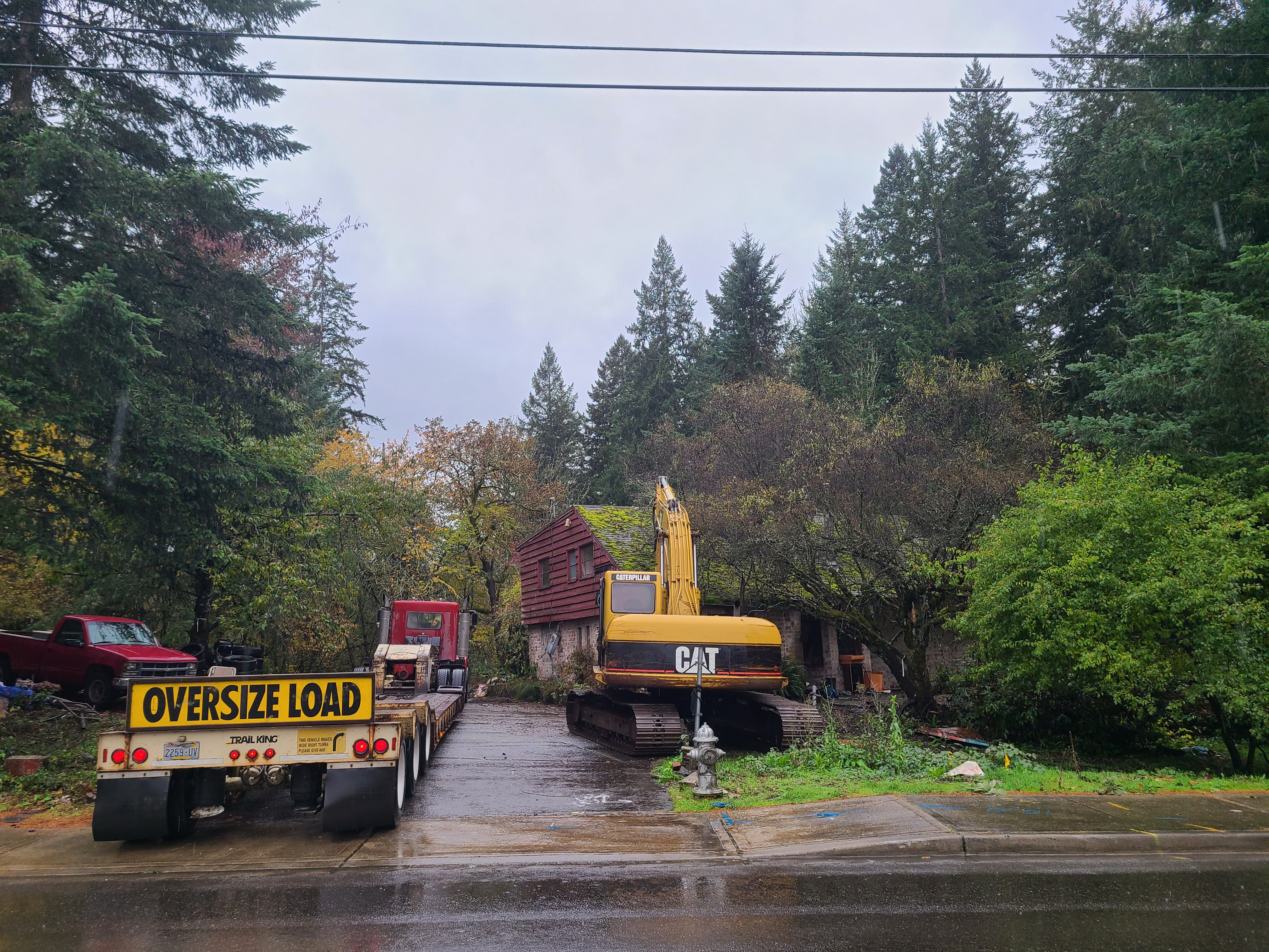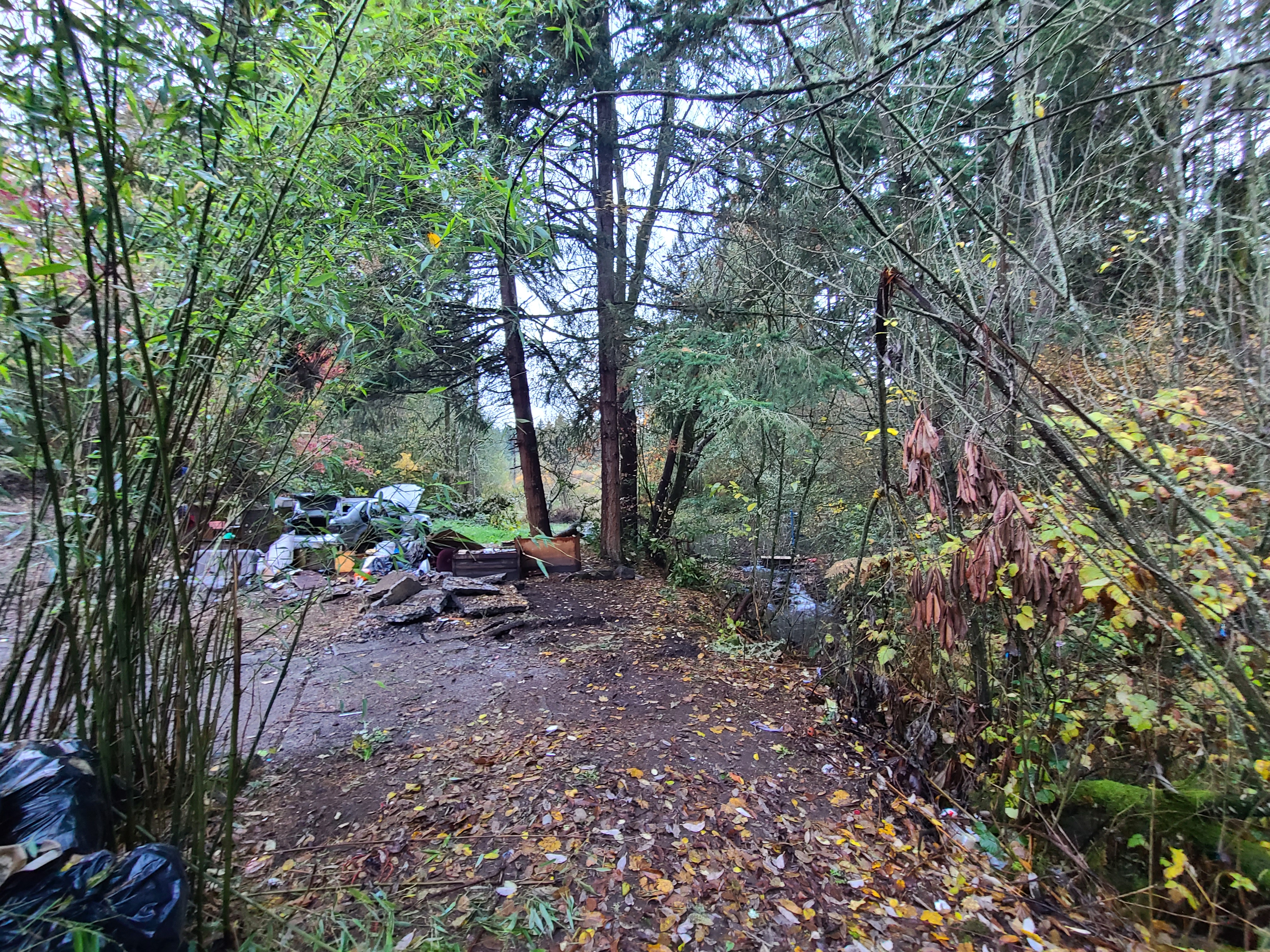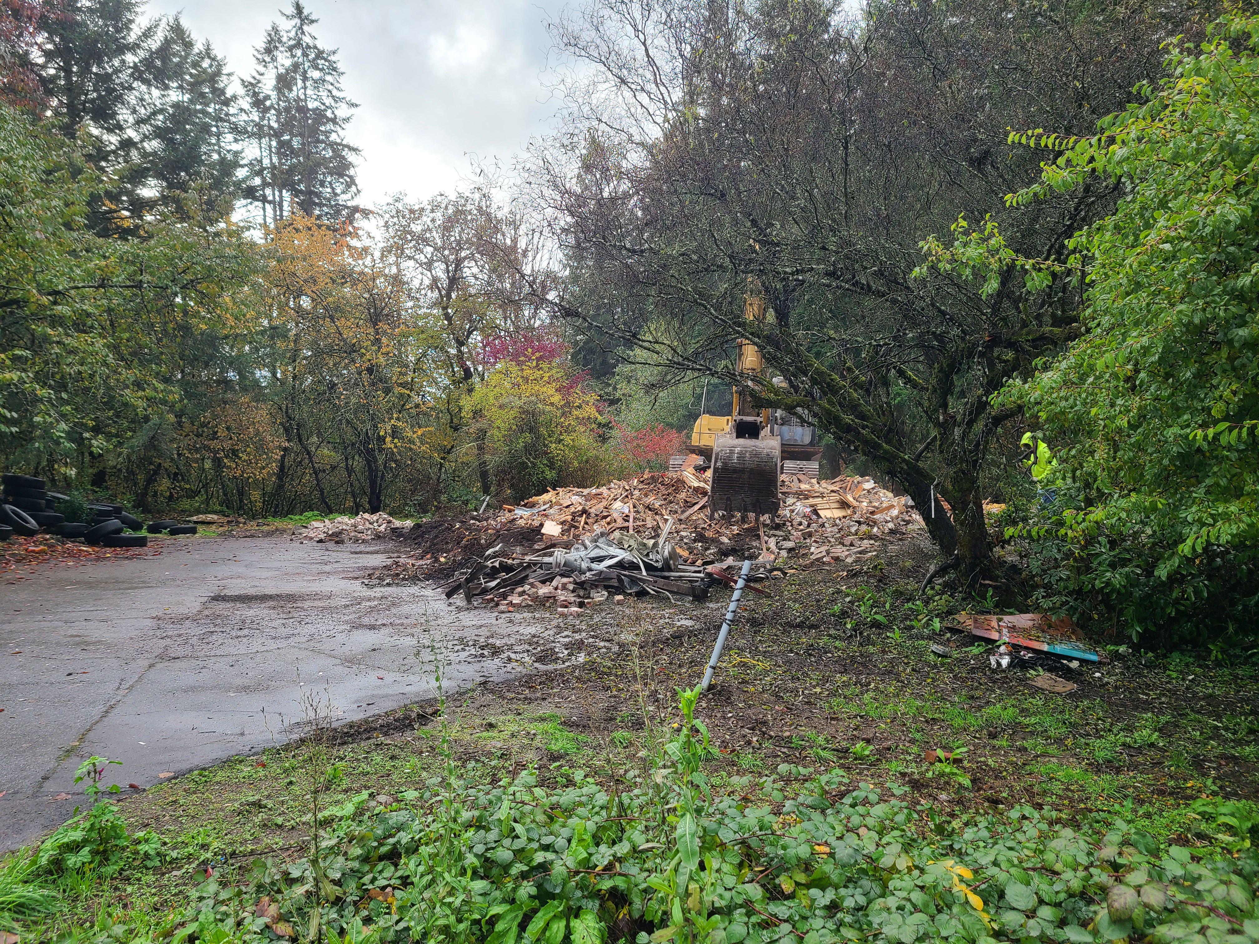 Now, just yesterday, Monday, November 6, 2023, a contractor was out on the former Mosier property demolishing the house. (17320 Spanaway Loop Road) Neighbors stopped for photos. I was forwarded the photos, then went there myself to see and take a few. There was definitely no sign of a silt fence to protect the Spanaway Creek (Coffee Creek) from any stray material falling into it.