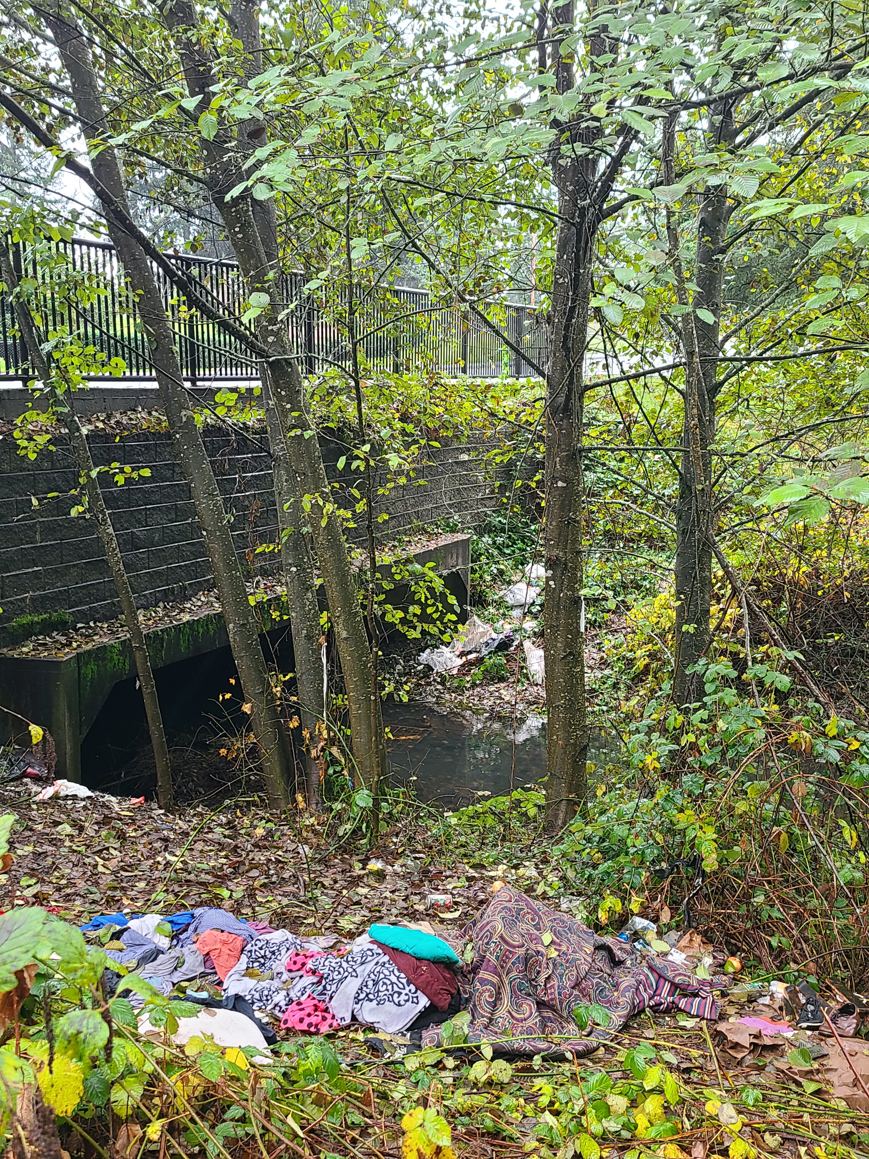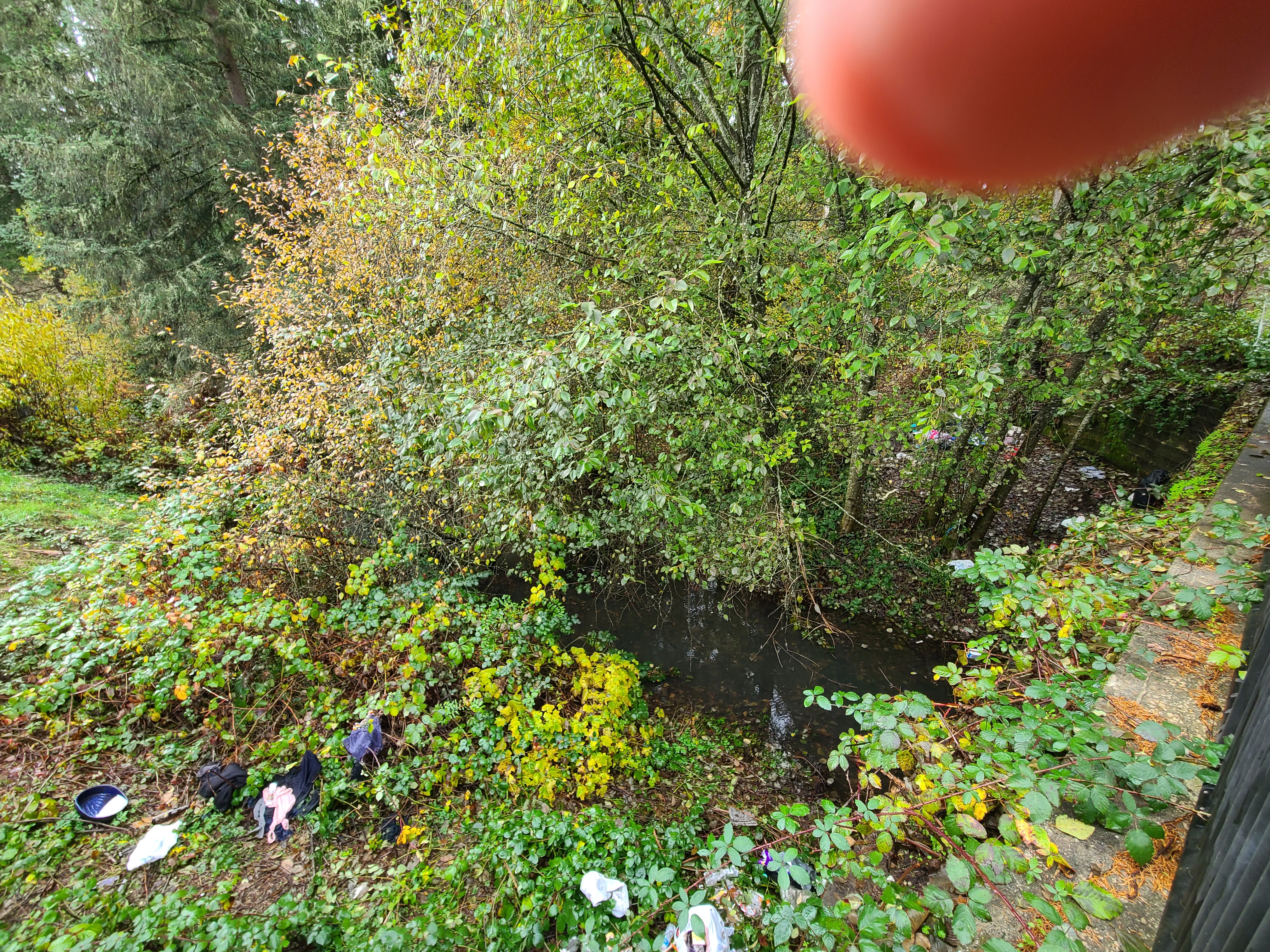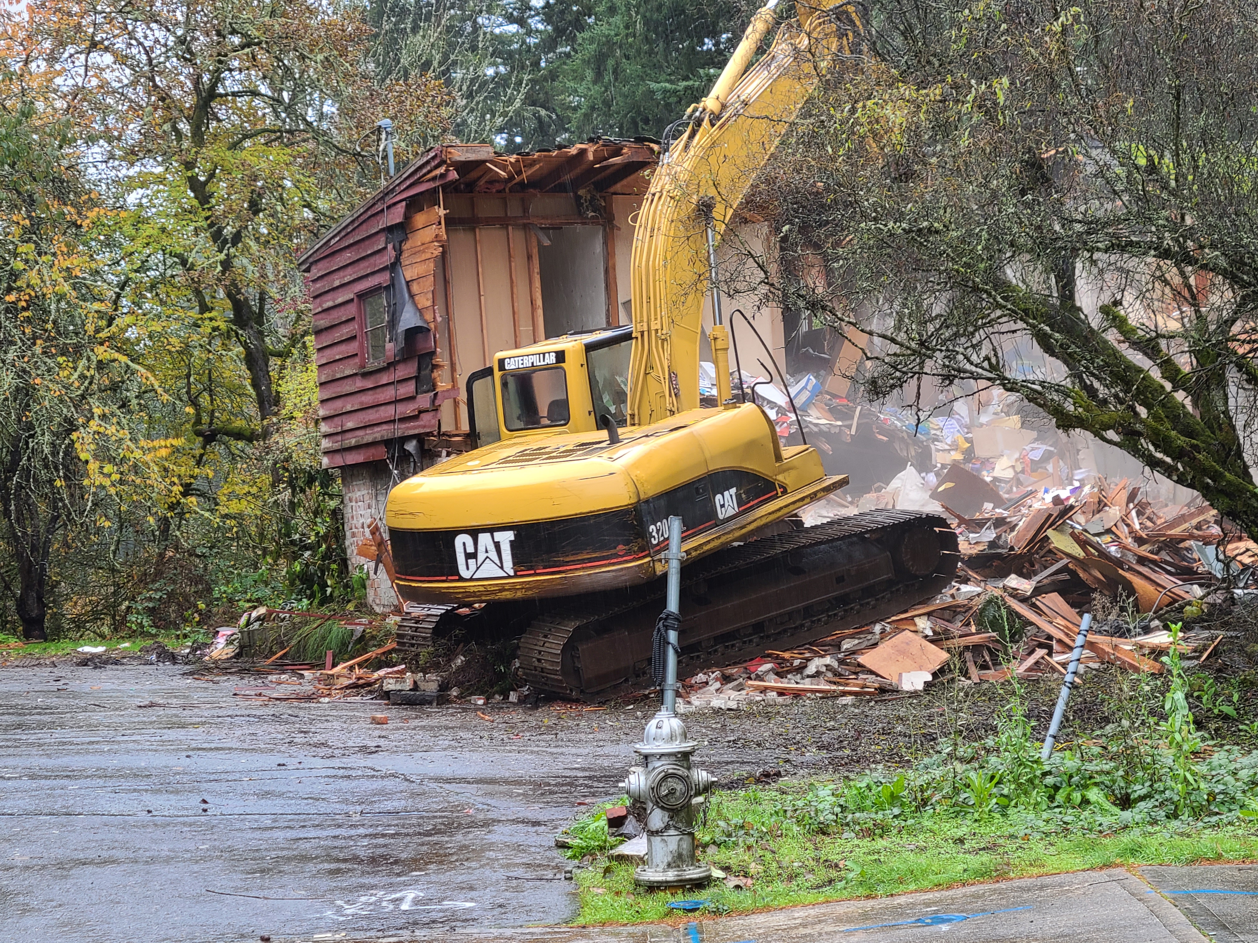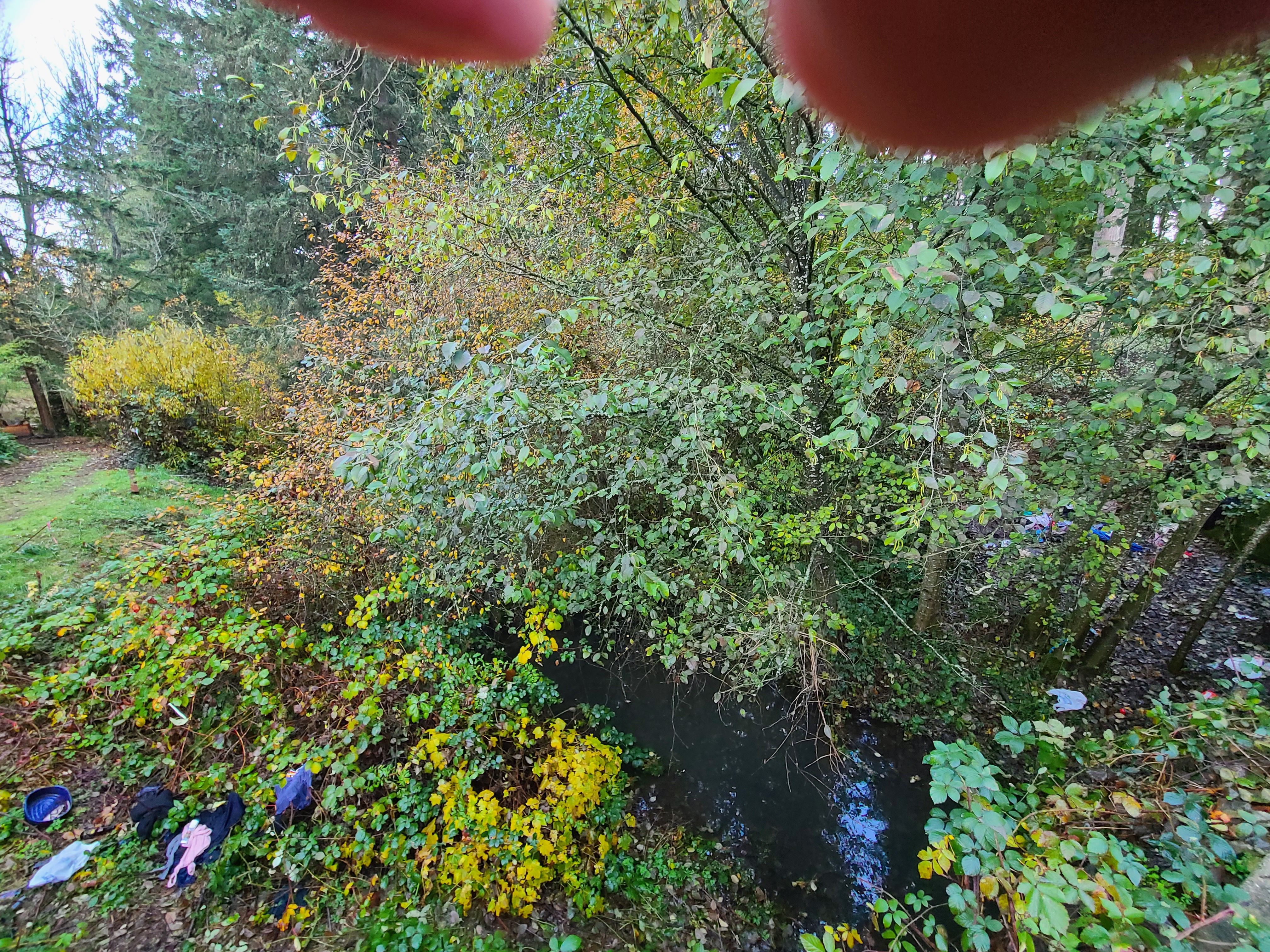 Now, just yesterday, Monday, November 6, 2023, a contractor was out on the former Mosier property demolishing the house. (17320 Spanaway Loop Road) Neighbors stopped for photos. I was forwarded the photos, then went there myself to see and take a few. There was definitely no sign of a silt fence to protect the Spanaway Creek (Coffee Creek) from any stray material falling into it.