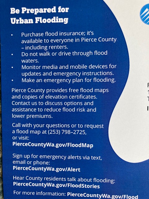 Every fall I get a big postcard from Pierce County reminding me I live in an area known to flood, the Spanaway-Parkland flood plain. And I know it’s true because twice in twenty-five years we have had hundred year floods here where I live along Spanaway Creek near 138th Street South and Spanaway Loop Road.