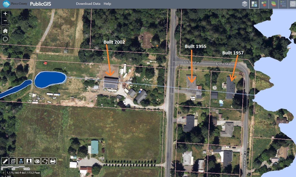 Prior to 1955, 47th Avenue was built and the ditch was an underground concrete culvert. Land between Bingham Road and 47th Avenue was divided into lots. In 1955, a house was built at the corner of Bingham and 120th Street. The drainage culvert was directly beneath the house. Again in 1957, another house was built on the corner of 120th Street and 47th Avenue, It is also on top of the concrete culvert.