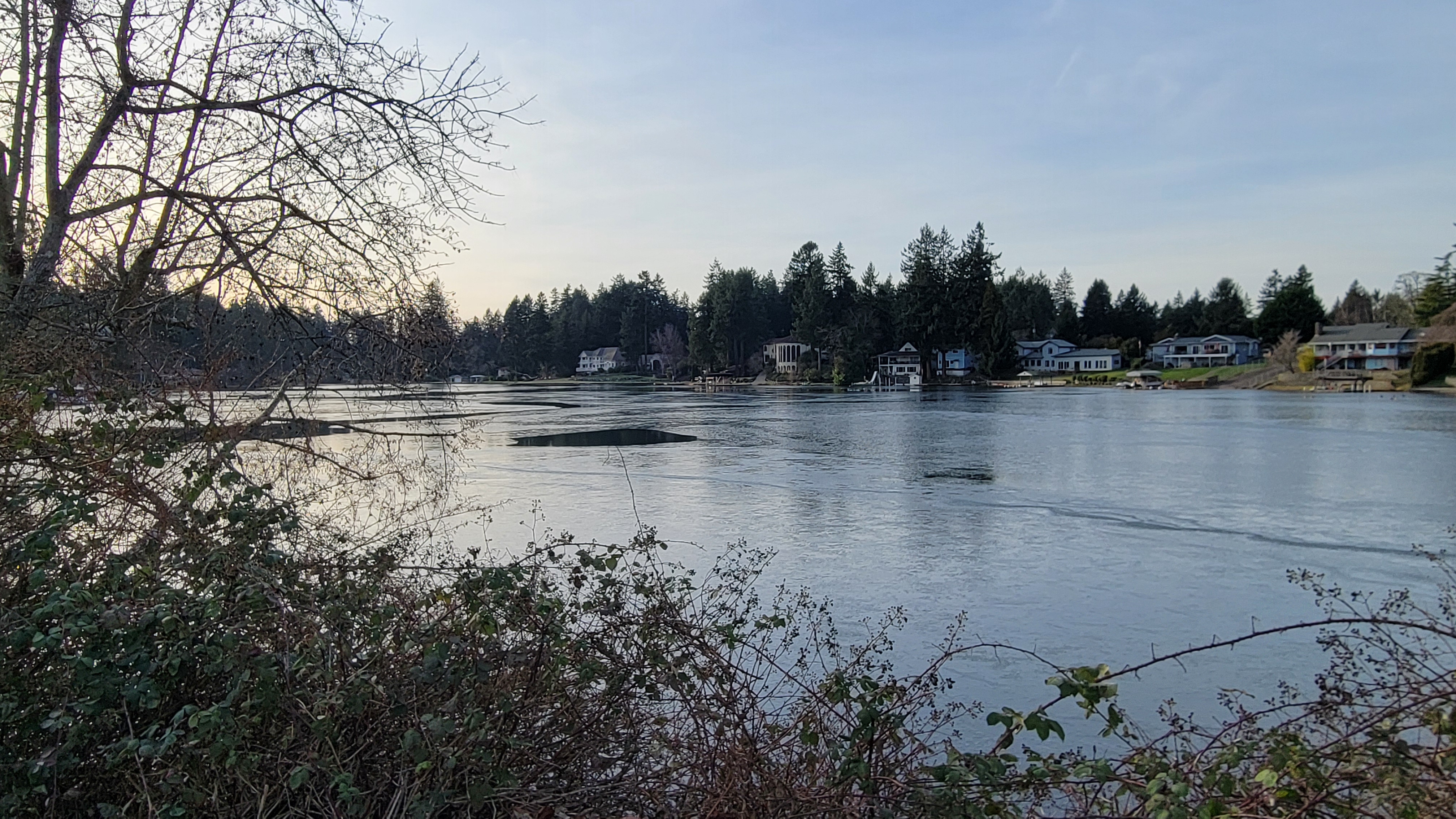 Clover Creek and Spanaway Lake resister the first day or so, but now that this weather has been dipping below 15 degrees F for several days, the north part of Spanaway Lake, known as the cove is starting to freeze. It is truly thin ice that no one can stand on, but it has frozen more than a third of the cove. Over by the park, it has not frozen, and the south side of the island to the south end of the lake has not frozen either.