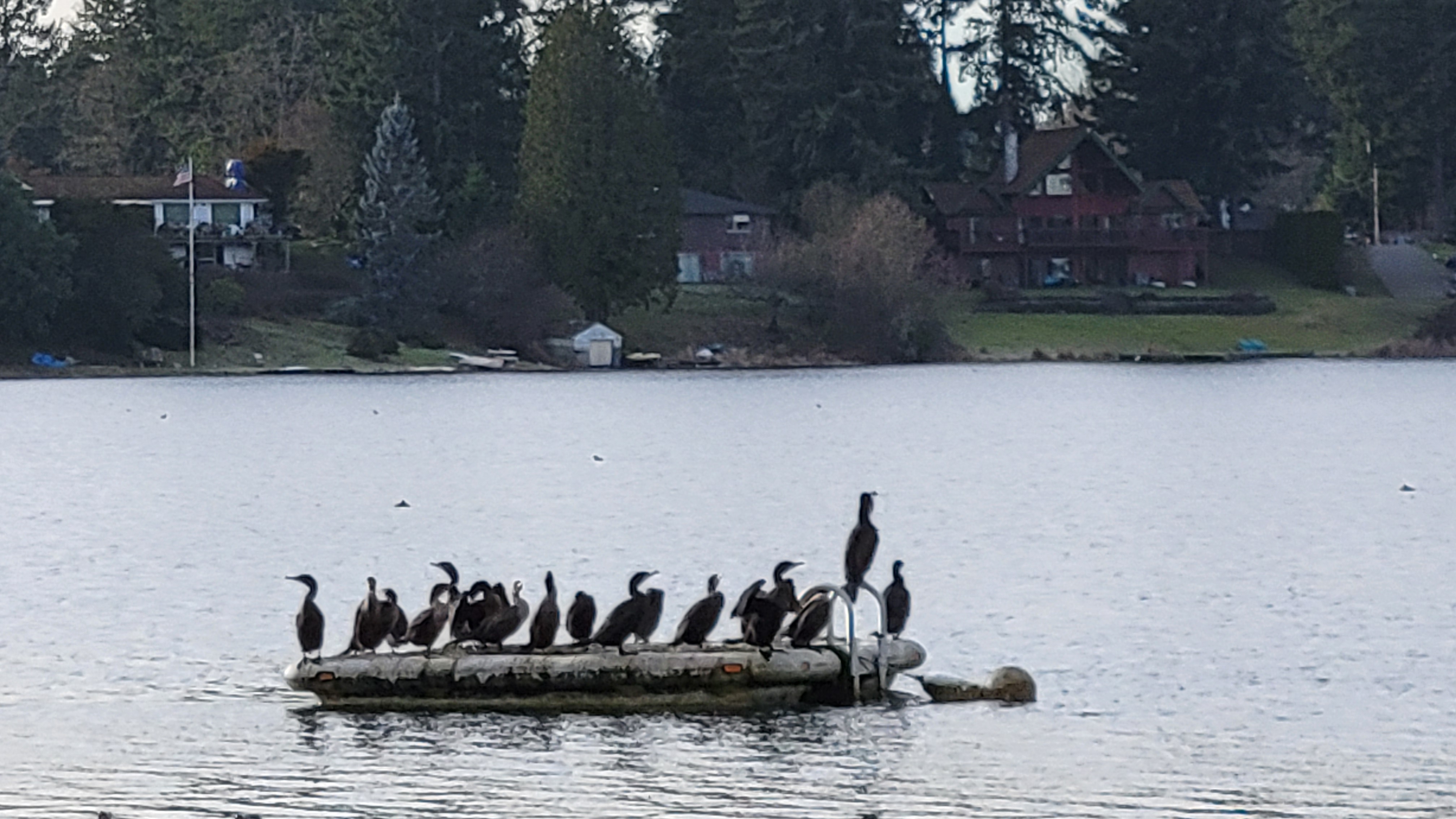 The ducks are near, but avoiding the ice. The cormorants; they clustered on a dock, just not having any part of that cold stuff.