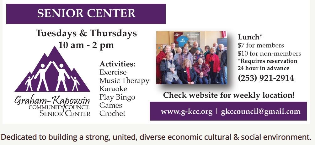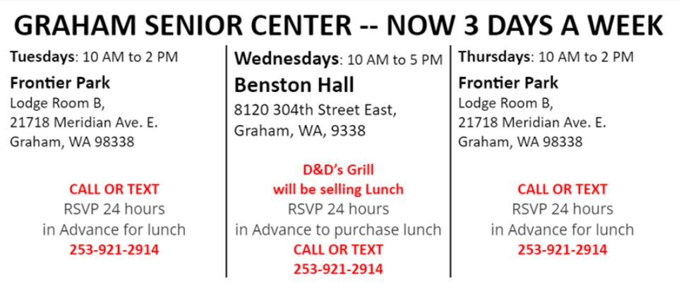 On Wednesdays from 10 a.m. to 5 p.m., there are now senior programs at the Benston Hall, 8120 304th Street E., Graham 98338. You can attend and have lunch with other seniors if you call 24 hours in advance. Lunch is $7 for members and $10 for non-members.