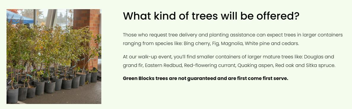 You are also welcome to come to our first-come first-serve Walk-up Tree Share Event on March 23rd, 2024 at Sprinker Recreation Center parking lot (14824 C St S, Tacoma, WA 98444). No pre-registration required!