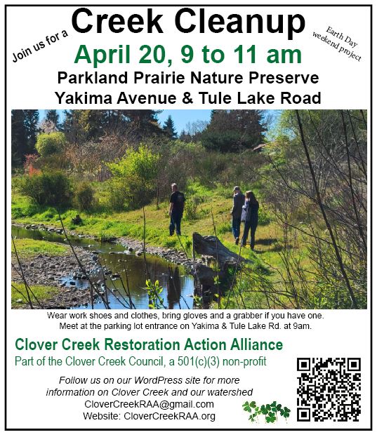 And they meant it when they said, boots on the ground. The Clover Creek Restoration Action Alliance (aka The Clover Creek Council) will hold its first creek cleanup this year. The Saturday before Earth Day, April 20, they will meet at 9 a.m. at Yakima Ave and Tule Lake Road, the Parkland Prairie Nature Preserve with a trailer, wheelbarrows, and garbage bags.