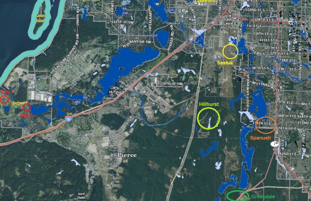 It shows early names of the sites, Spanueh Lake (Spanaway Lake), Osprey Lake (Spanaway Marsh), Cow Swamp (straddling Spanaway Loop Road), Narrow Lake (Between Spanaway Loop and Perimeter Road at 159th to 155th St).