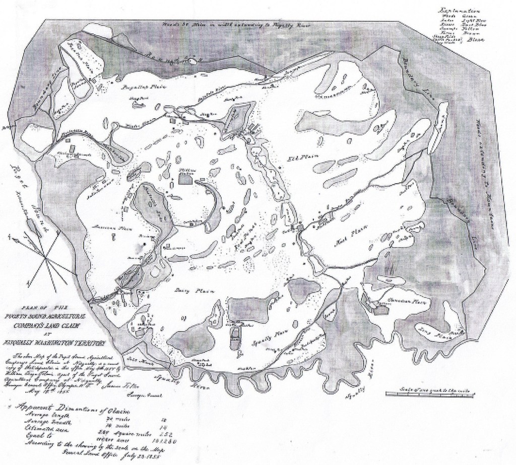 To local Indians, the area was referred to as “spáduwe” – “where [camas or fern] roots are plentiful”.[1] Multiple tribes used the area for hunting and gathering. Used by many, it was specifically claimed by none. (Cowlitz, Chehalis, Nisqually, Squaxin, Sequalitchew, Steilacoom, Puyallup, Yakima, and more)