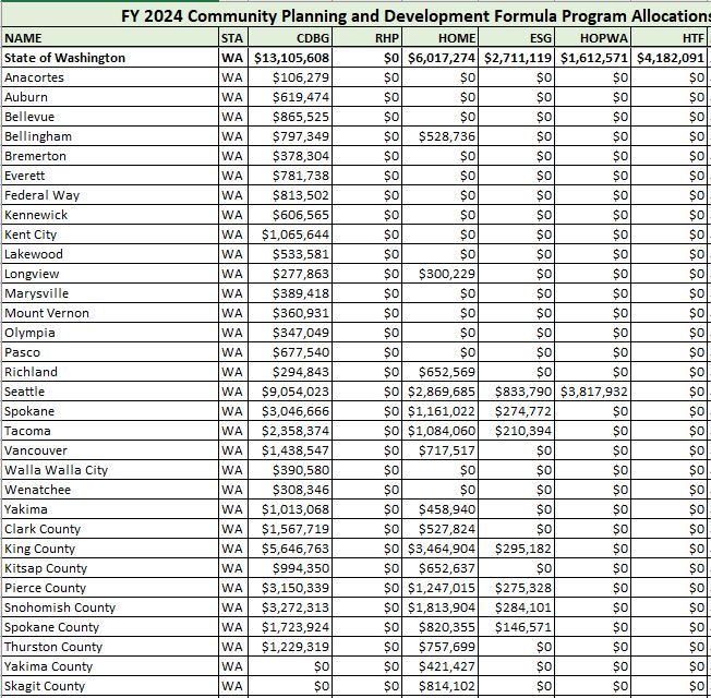Sen. Cantwell fought to secure funding for the CDBG, HOME, and HOPWA programs this fiscal year. Sen. Cantwell previously signed letters to U.S. Senator Brian Schatz (D-HI) and U.S. Senator Cindy Hyde-Smith (R-MS) – Chair and Ranking Member of the Senate Appropriations Subcommittee on Transportation, Housing and Urban Development, and Related Agencies – urging increased funding for each of these programs. Sen. Cantwell requested $4.2 billion for the CDBG program; $2.1 billion for the HOME program; and $600 million for the HOPWA program. As a result, these programs received $3.325 billion; $2.1 billion; and $499 million respectively, avoiding steeper cuts faced by other programs during the FY23 budget debate. A full nationwide city-by-city breakdown of the municipalities in Washington state that received funding today is available as a spreadsheet download HERE.