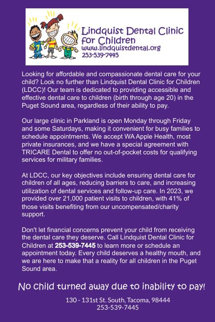 Karen Lewis, Community Outreach and Engagement Manager from Lindquist Dental Clinic for Children recently reached out to the Pierce Prairie Post to make our readers aware of their services for children in need.