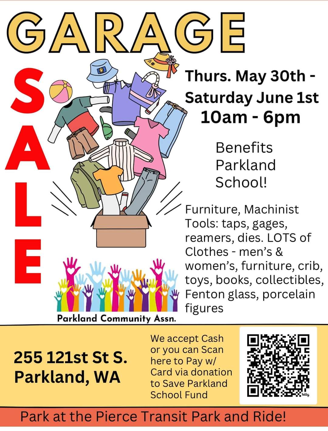 Fram May 30 to June 1, there will be a garage sale across the street from the school at 255 121st St. S., Tacoma, WA 98444. Hours are 10 a.m. to 6 p.m. Cash will be accepted; card donations can be made to the QR code on the poster. You can park next door at the Park and Ride.