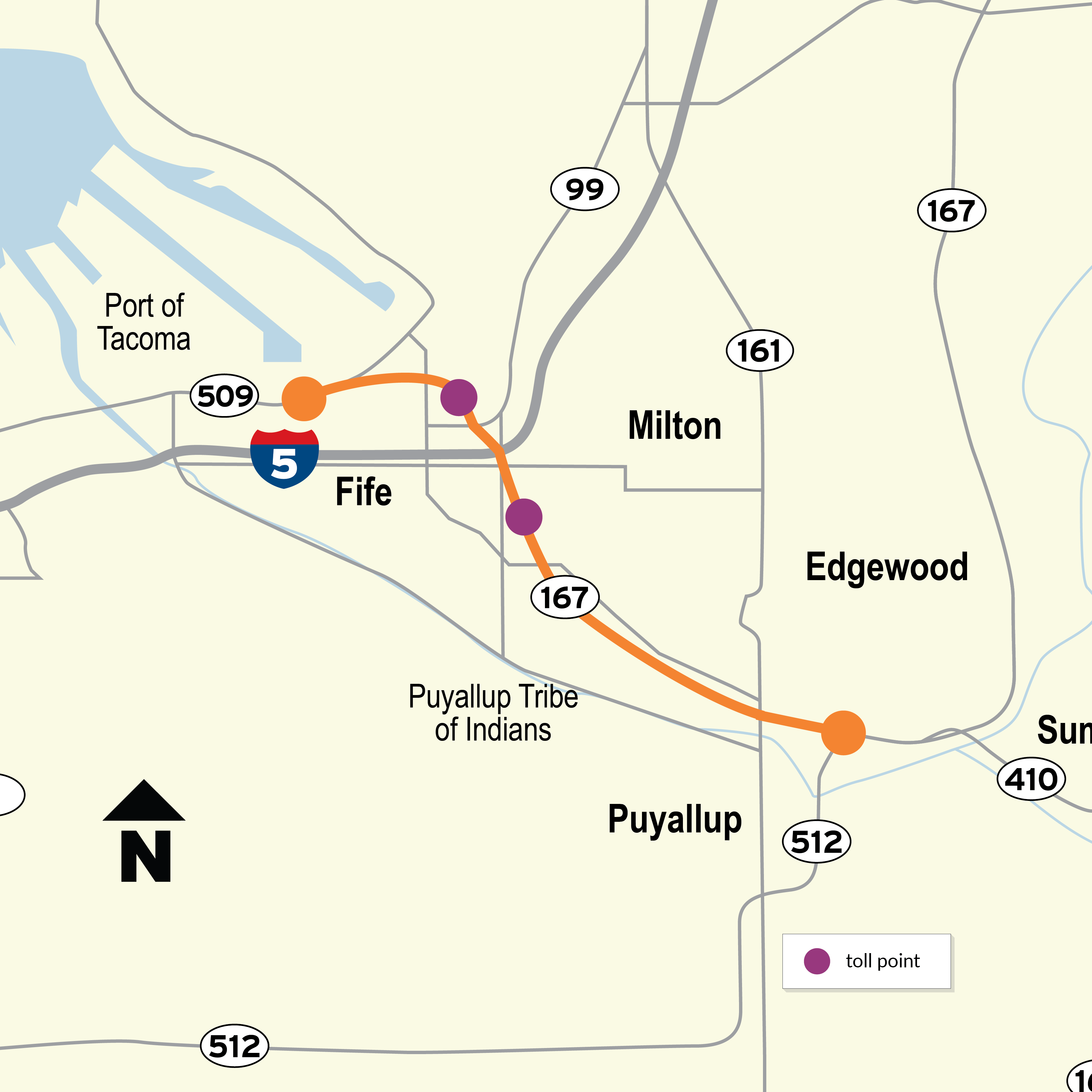 The Washington State Department of Transportation’s SR 167 Completion Project builds 6 miles of new tolled expressway to create new connections to Interstate 5 and the Port of Tacoma. In addition to extending SR 167, the project includes restoring more than 263 acres of wetlands and builds a combined 13 miles of sidewalks, shared-use paths and bike lanes for non-motorized travelers, including nearly 8 miles of the spuyaləpabš Trail. When SR 167 is complete, the new highway will improve the movement of freight and reduce congestion on local roads and highways.