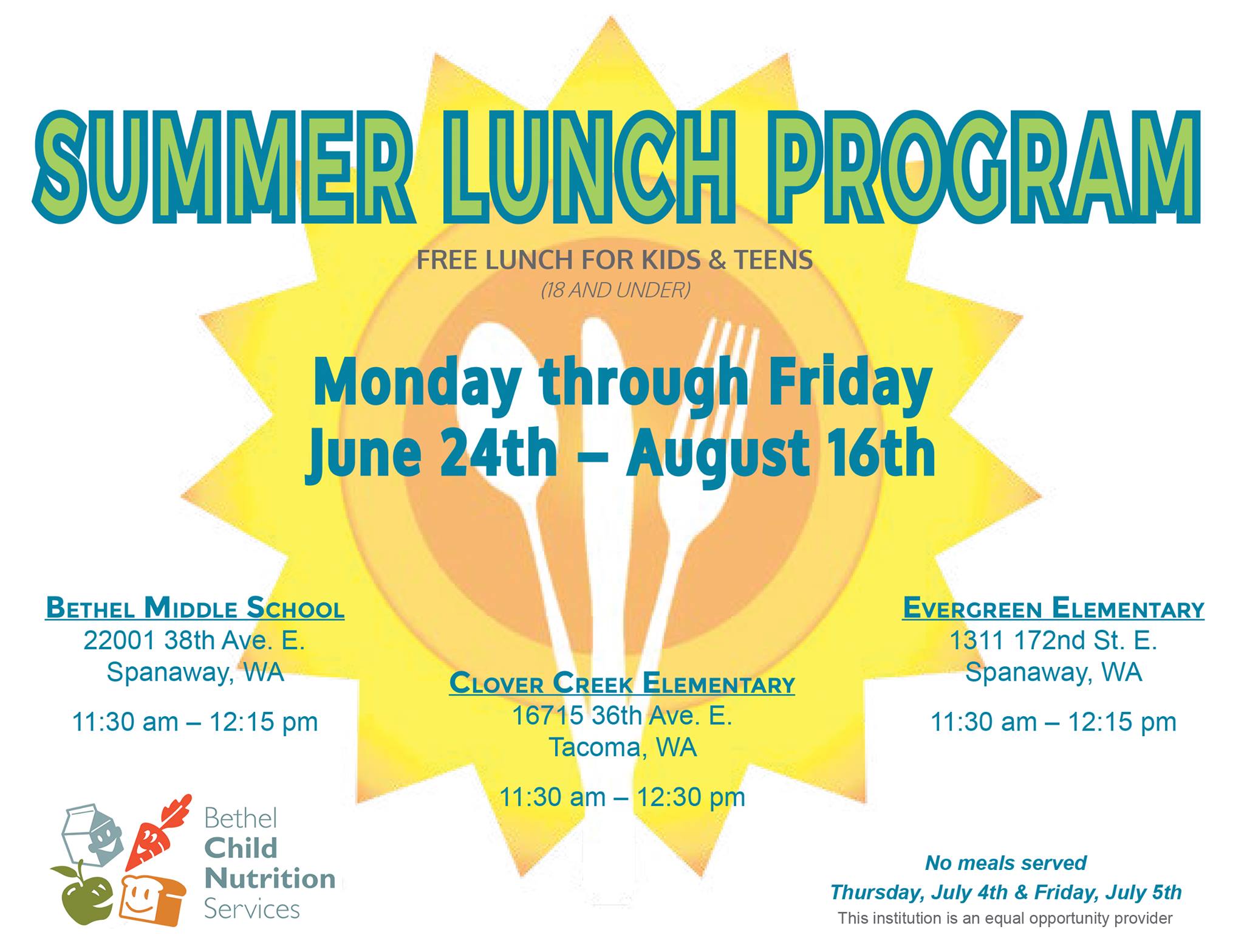 Summer also makes it harder for struggling families to feed their kids that are not getting breakfast and lunch at school. Many school sites have free lunches for these kids daily. Look for the posts or on the district websites to find the locations. Franklin Pierce Bethel District