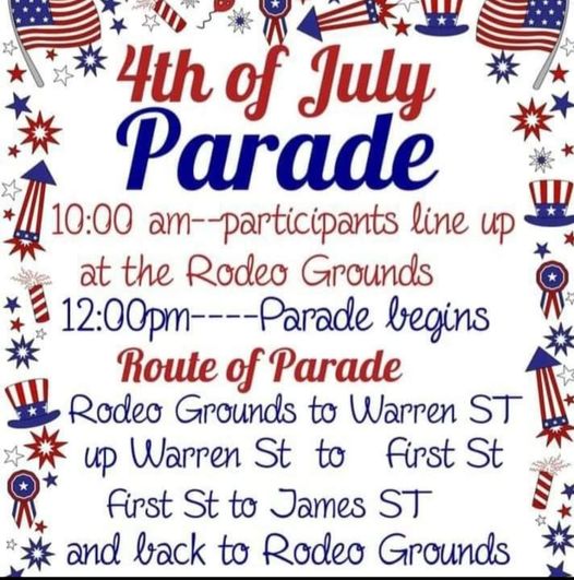 The City of Roy will have a parade at noon on the 4th of July. That event runs from the rodeo grounds along Warren Street to First then back on James St. to the rodeo grounds.