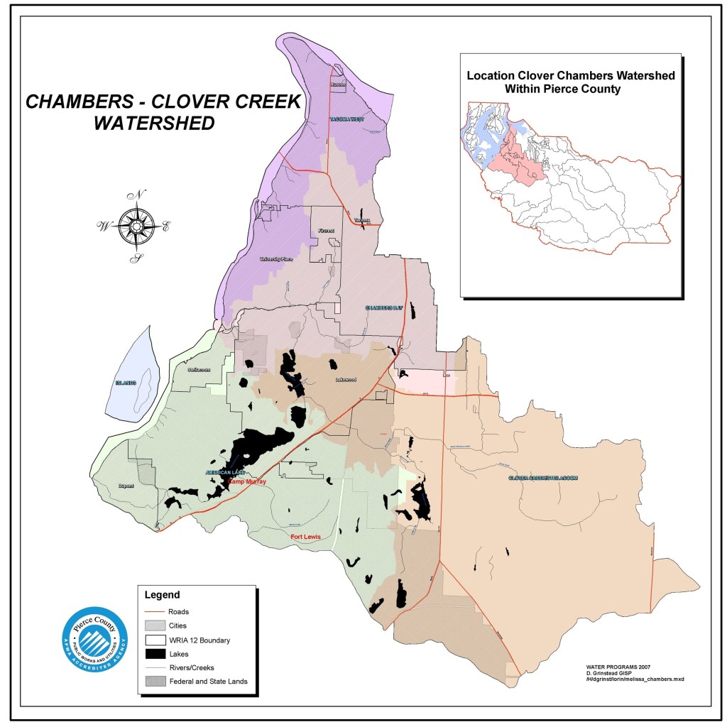 Streams in the area are also fed by this interaction of rainfall and groundwater aquifers. In Parkland Spanaway the water system known as the Chambers Clover Watershed (Water Resource inventory Area 12, WRIA 12). Here is a map of WRIA12: