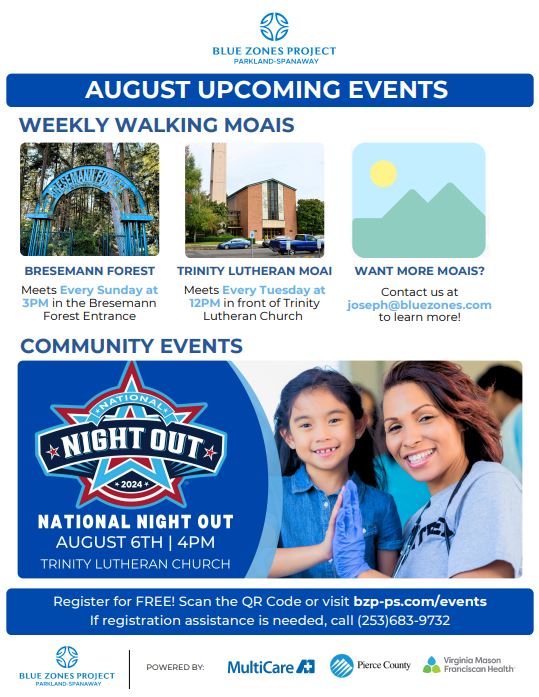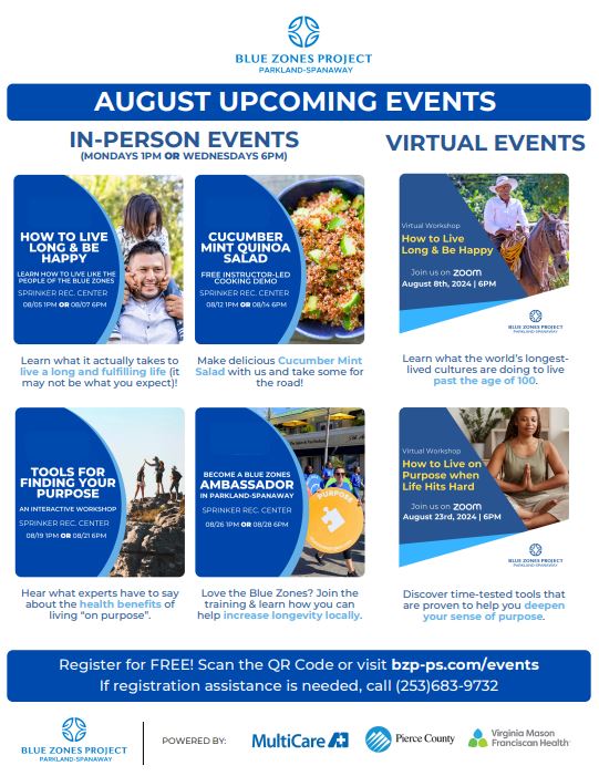 The following events are taking place in August with the Blue Zones Project Parkland-Spanaway. Blue Zones are places in the world that the National Geographic identified as places that people commonly live to be 100. Parkland Spanaway is not one of them, in fact, we have the lowest life expectancy on an average than the rest of the county.