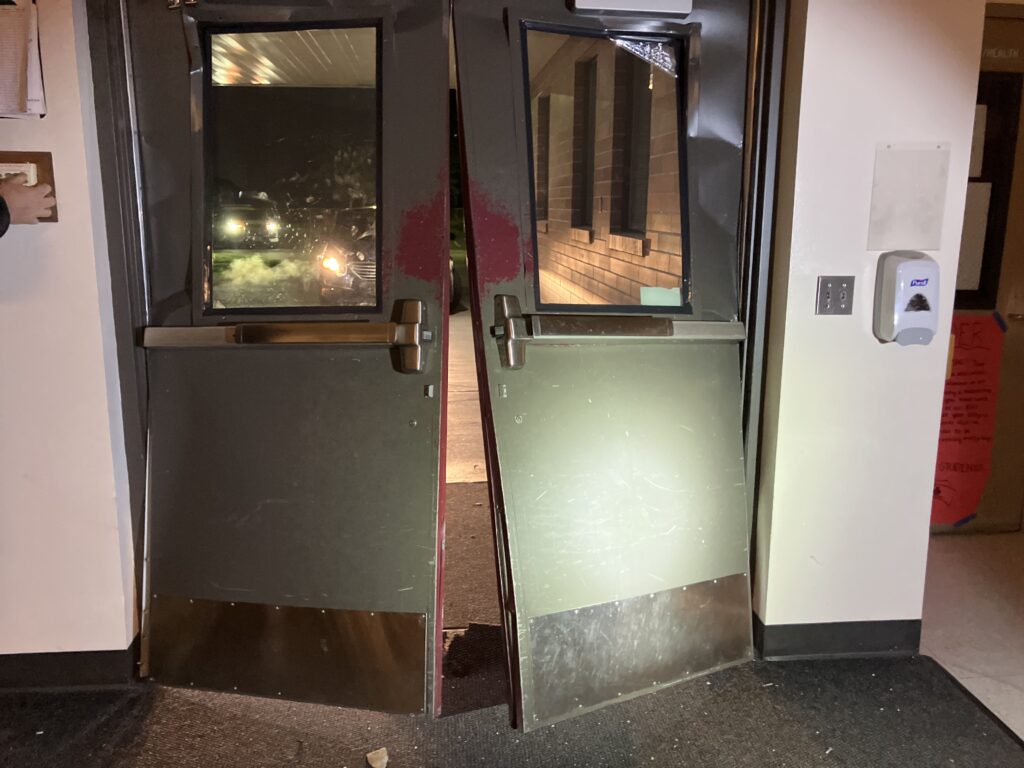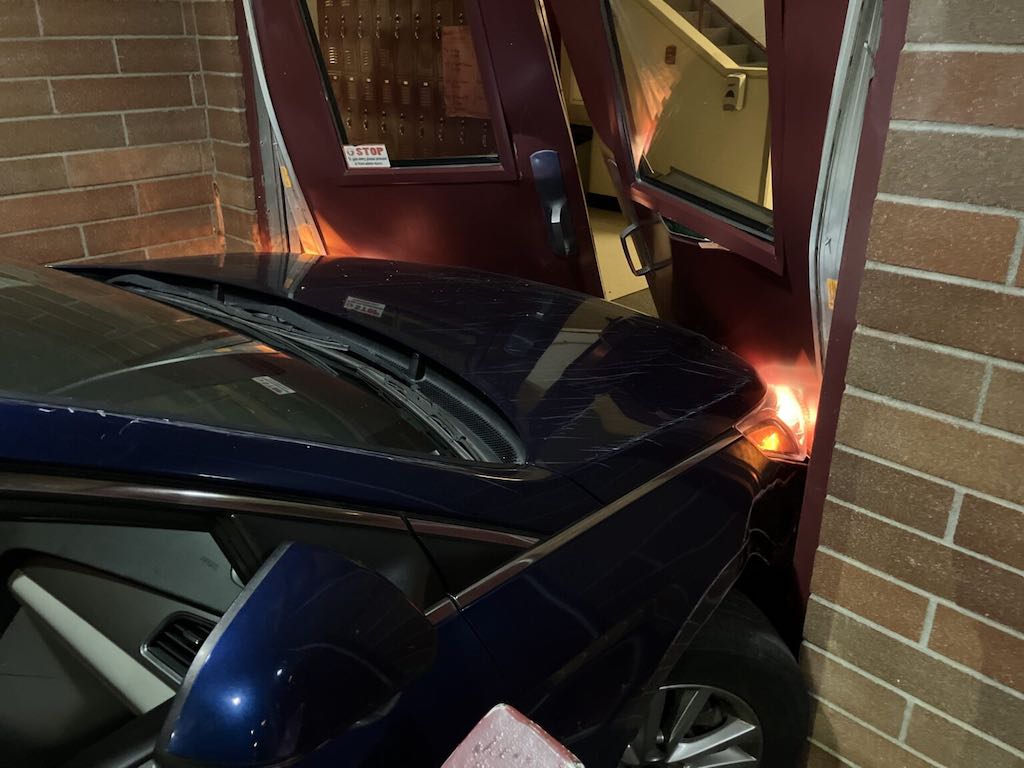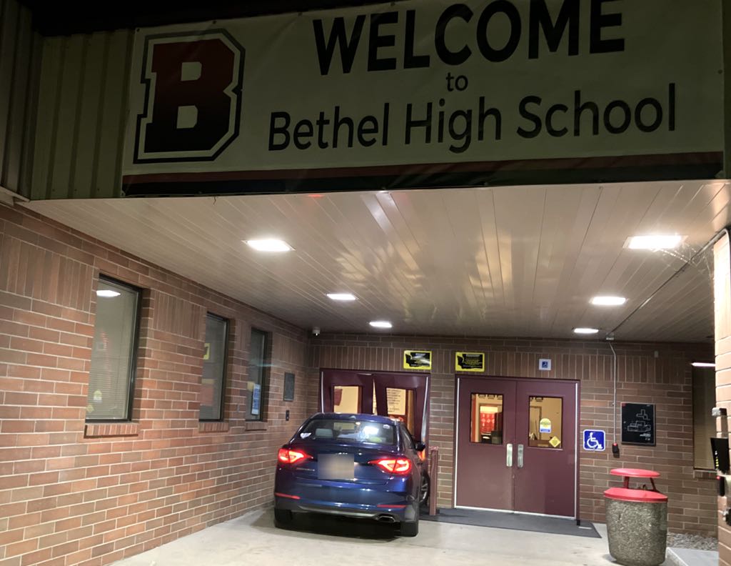 At 04:40 am, on Tuesday October 1st, a 911 caller said they saw a vehicle crash through the fence at Bethel High School. At 04:52 am, security arrived on scene and found a Hyundai sedan crashed into the front doors. The engine was running and no one was seen near the vehicle.