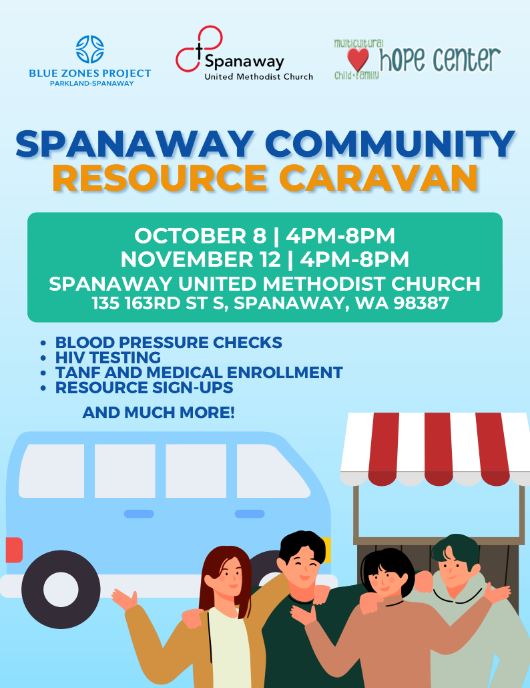 Join us for the Spanaway Community Resource Caravan on November 12th from 4PM to 8PM at Spanaway United Methodist Church!