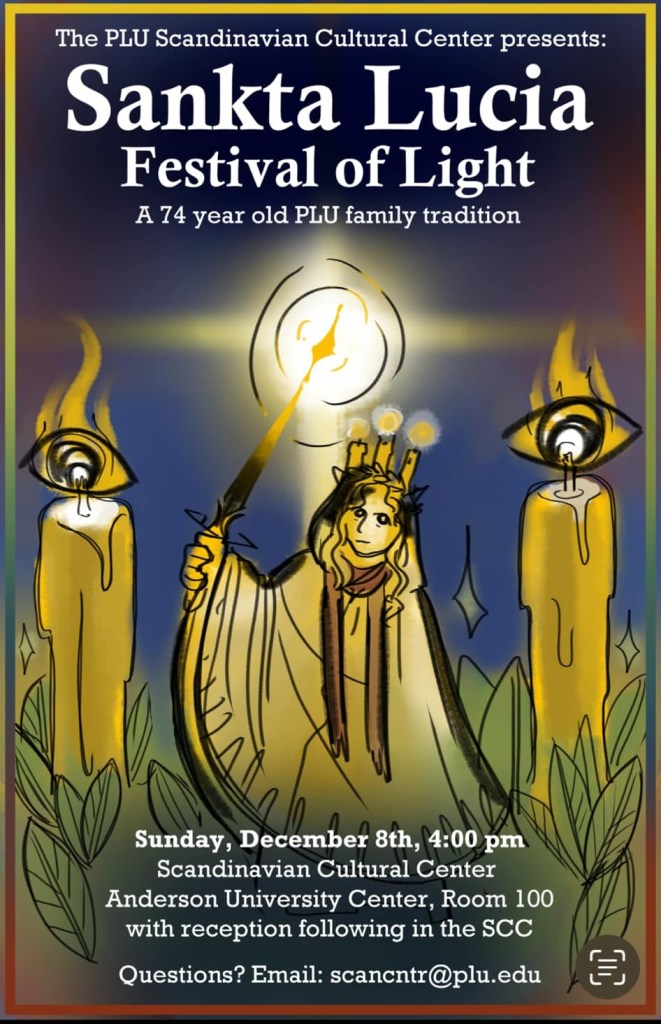 Sankta Lucia is a tradition at Pacific Lutheran University. Not only do they sing songs and put on a wonderful student led program, there is actually a Lucia Bride chose who wins a scholarship. The scholarship portion is based on essays written by the participants and evaluated by a team from the Scandinavian Cultural Council. This event has been a tradition at PLU for 74 years.