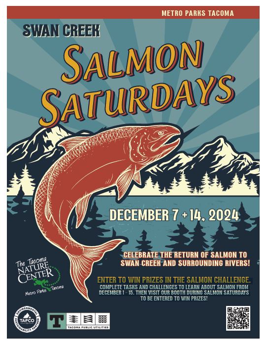 Enter to win prizes in the salmon challenge. Complete tasks and challenges to learn about salmon from December 1 – 15. Then visit the Tacoma Nature Center booth during salmon Saturdays to be entered to win prizes!