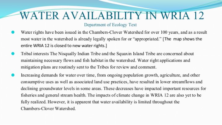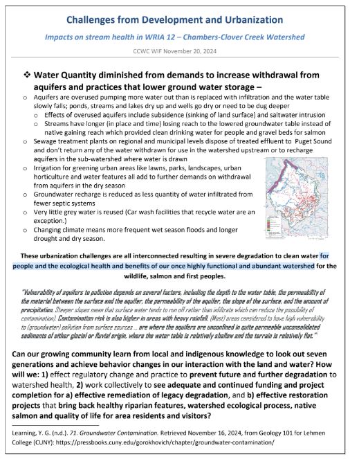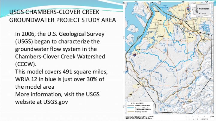To top it off, Renee Buck, President of the Chamber Clover Creek Watershed Council (CCWC) asked Tom Kantz of Pierce County Surface Water Management at a meeting on November 12 about how the County monitors ground water. His answer was, “We don’t.” A few intense moments followed between them and Al Schmauder, a 30-year creek advocate. Kantz punted to the Washington State Department of Ecology, but they only approve well applications. They do not quantify the water either. The USGS does do some groundwater modeling, but is it sufficient, frequent or local enough to solve our issues?