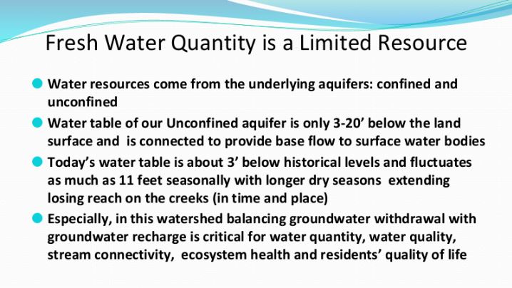 County Surface Water Management drained the flooding areas, but at the same time, the clearing and grading for warehouses, parking lots, roads, and roofs, blocked the natural pathways for water to reenter the aquifer. All the new housing on sewers is flushing a lot of water out to sea, not back into the aquifer either.