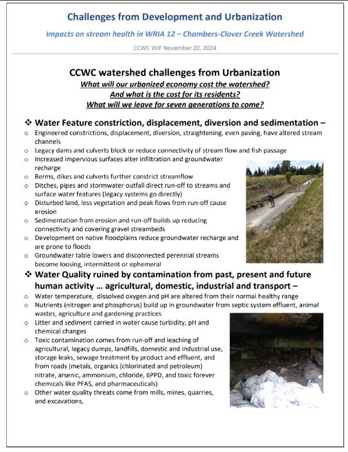 On November 20, 2024, the CWCC held its annual issues forum. Urbanization and water availability were topics there too. Speakers questioned temperatures, pollution, loss of water to sewers and more. This issue is not going away. If anything, it will be getting more and more attention.