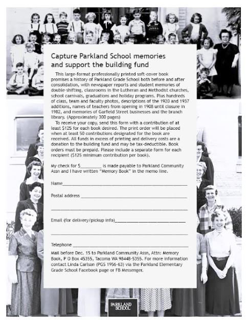 To reserve a copy of the 550+ pages book, mail a contribution of at least $125 to Parkland Community Assn, Attn: Memory Book, P O Box 45355, Tacoma WA 98448-5355 prior to Dec. 30. All funds in excess of printing and delivery costs are a donation to the building fund and may be tax-deductible. The association is a 501(c)(3) nonprofit organization. Books should be available in February 2025.