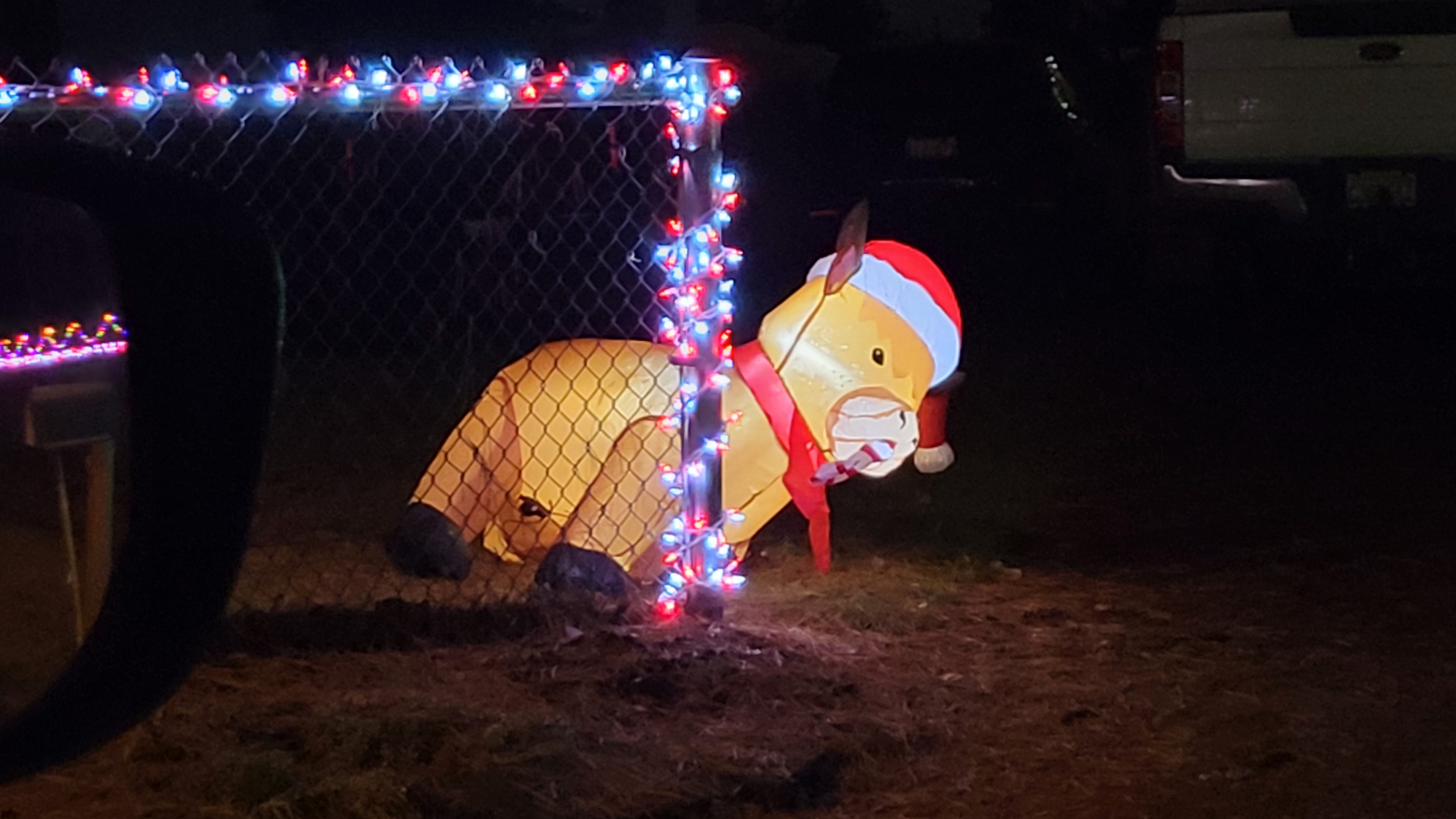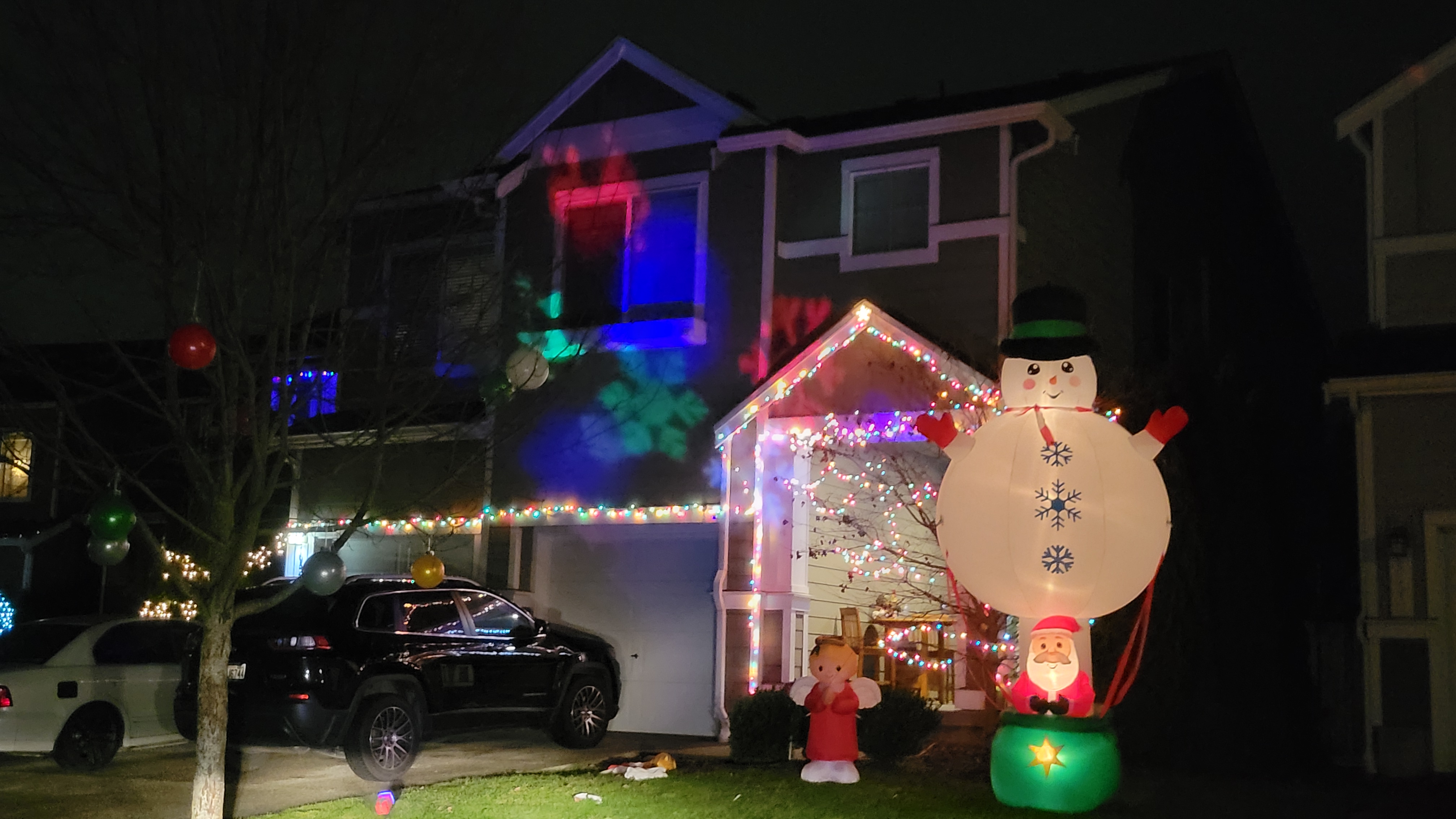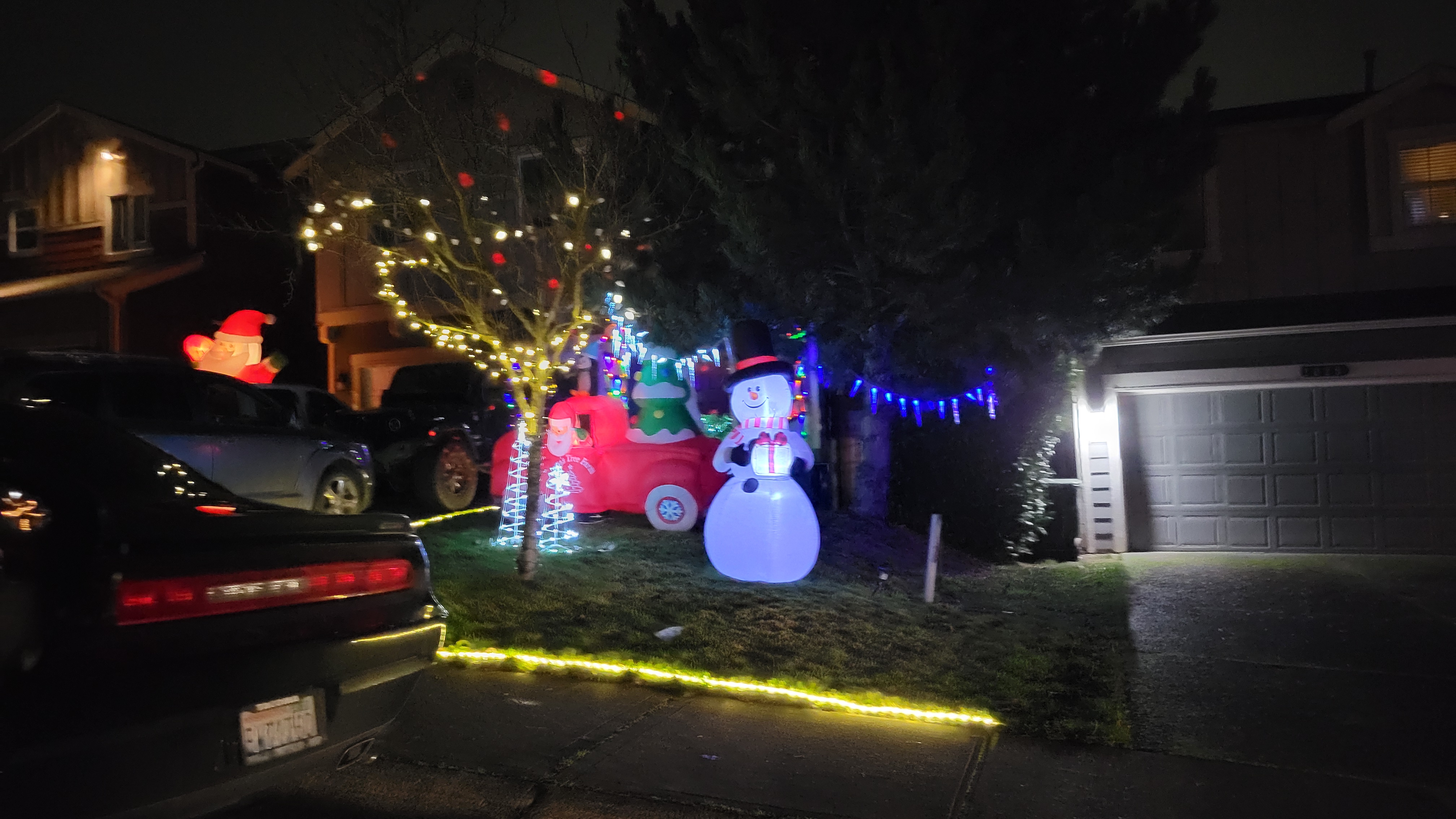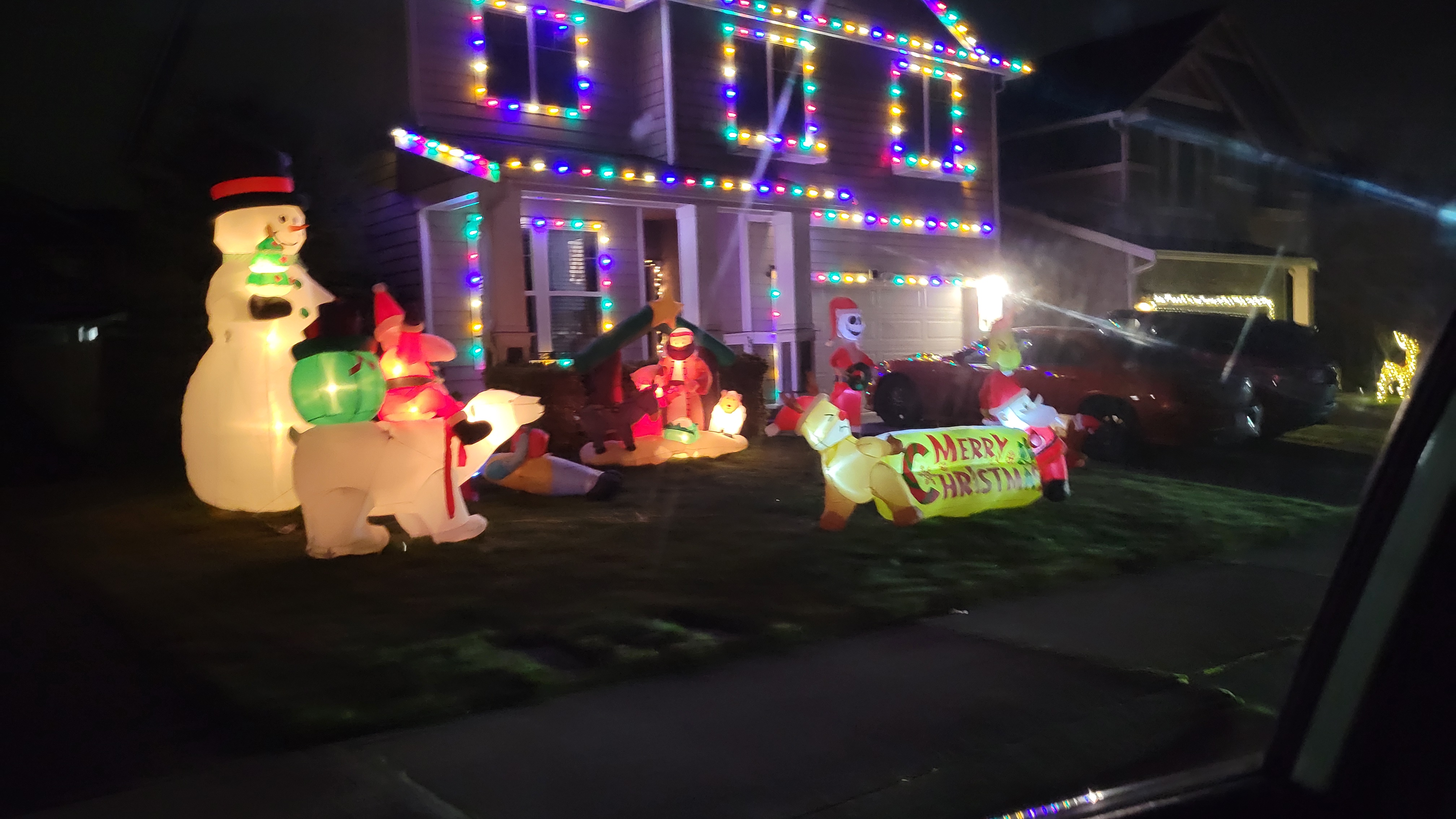 This year’s most memorable were a tipped cow and a snowman run over by Santa in a truck. The other had unique inflatables, a Woody with a Christmas tree on top, a Star Wars Walker, and cars parked in front of the house, so the photo was difficult to capture.