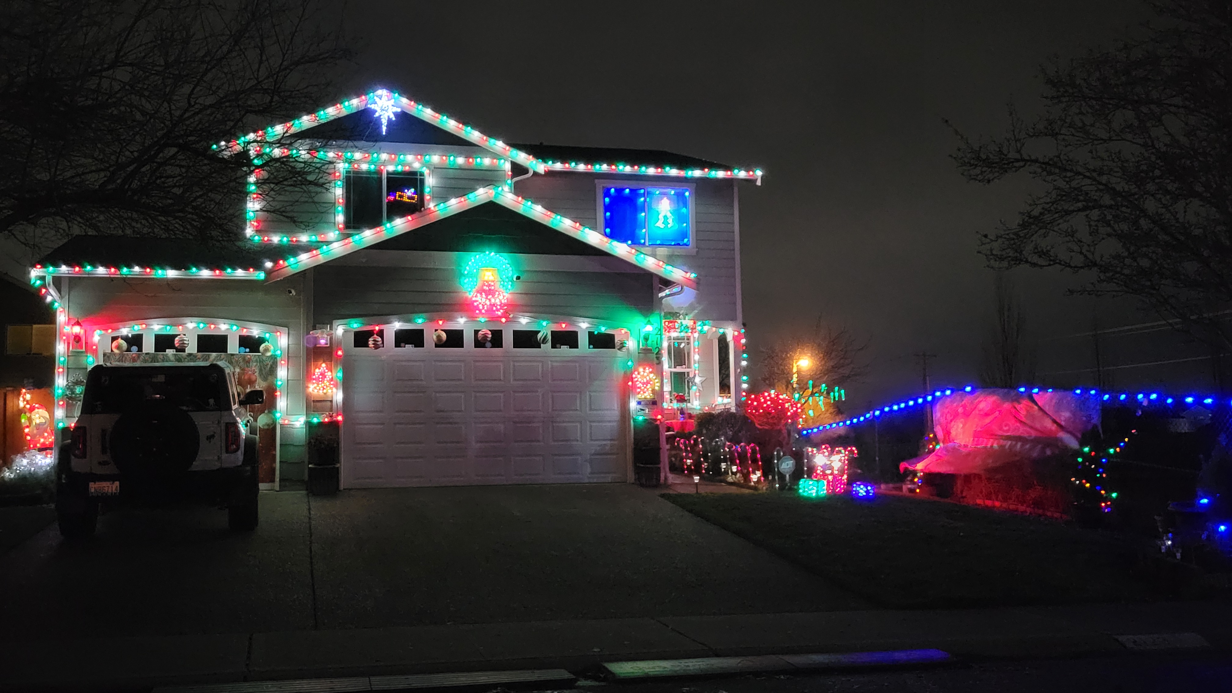Spanaway had a house in pink and blue and Parkland had a house whose living room window was entirely a running reader board saying Merry Christmas.