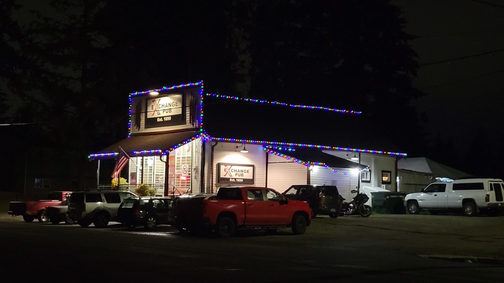 The historic Spanaway Exchange Pub was lit up as was the Paradise Bowling Alley, Davita, and PLU with lights around several tree trunks on campus.