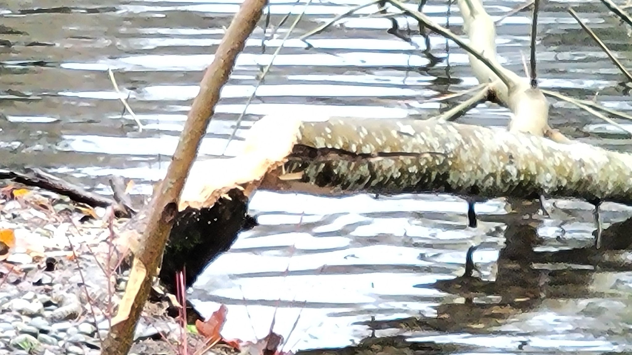 Walking the park today, the beavers have been attempting to build a dam across the narrow passage from the main lake to what is called “Little Spanaway,” the smaller pond on the North end of the park. In doing so, they are felling a number of shore area trees.