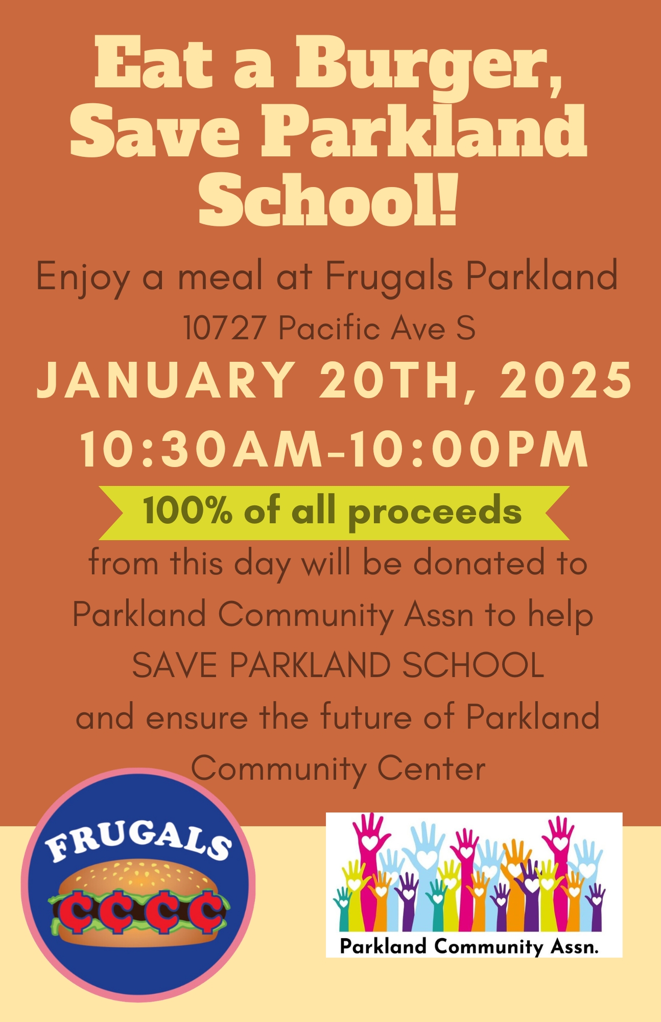 On January 20, all day, if you buy a snack or a meal at Frugal’s in Parkland, the profits all go to the Parkland Community Center.