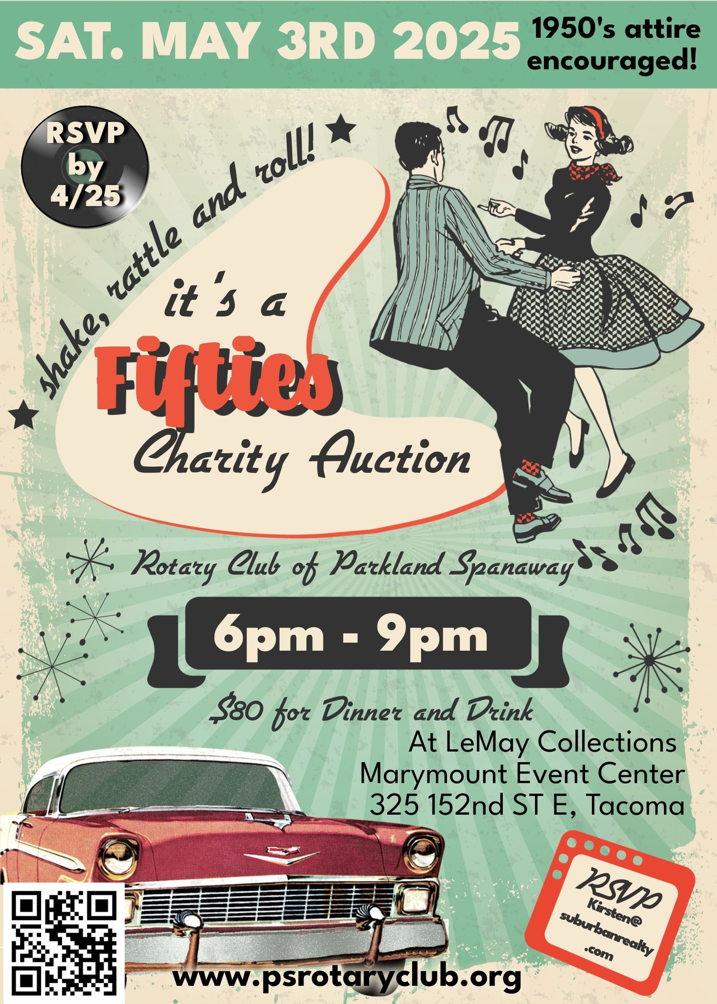 The event theme is “Shake, rattle, and roll,” it is a fifties themed charity auction. If you have 50’s attire, please wear it.