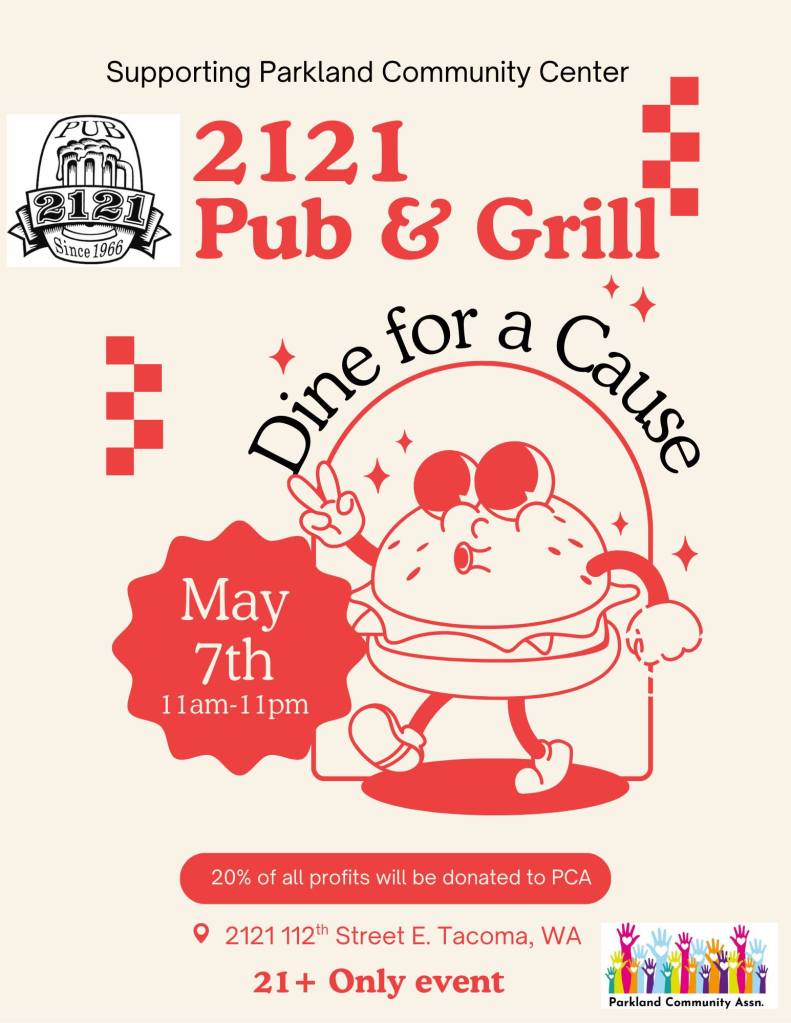 The 2121 Pub & Grill at 2121 112th St E, Tacoma, WA 98445, will be the site of a fundraiser for the Parkland Community Center purchase on May 7. A portion of what you spend eating there will go to the charity fundraising.