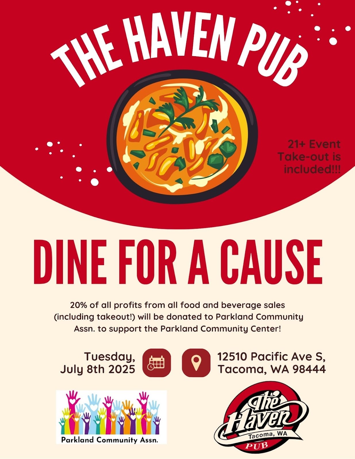 On July 8, 2025, from 11 a.m. to 11 p.m., the Haven Pub will be sharing its profits with the Parkland Community Center. For every meal and drink you purchase, a portion will go back to the Parkland Community Association’s project to pay for and restore the former school building to the benefit of the community.