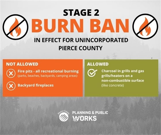 Pierce County issued a Stage 1 burn ban in June. Under the Stage 2 burn ban, no outdoor burning is permitted, including recreational burn pits, backyard fire pits, or backyard fireplaces, in unincorporated Pierce County.