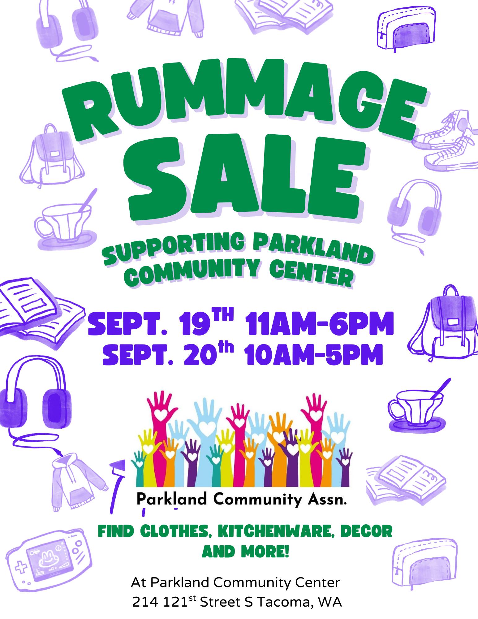 Located at 214 121st St E, Parkland, WA, the Rummage sales will take place from 11 a.m. to 6 p.m. Friday and 10 a.m. to 5 p.m. Saturday.