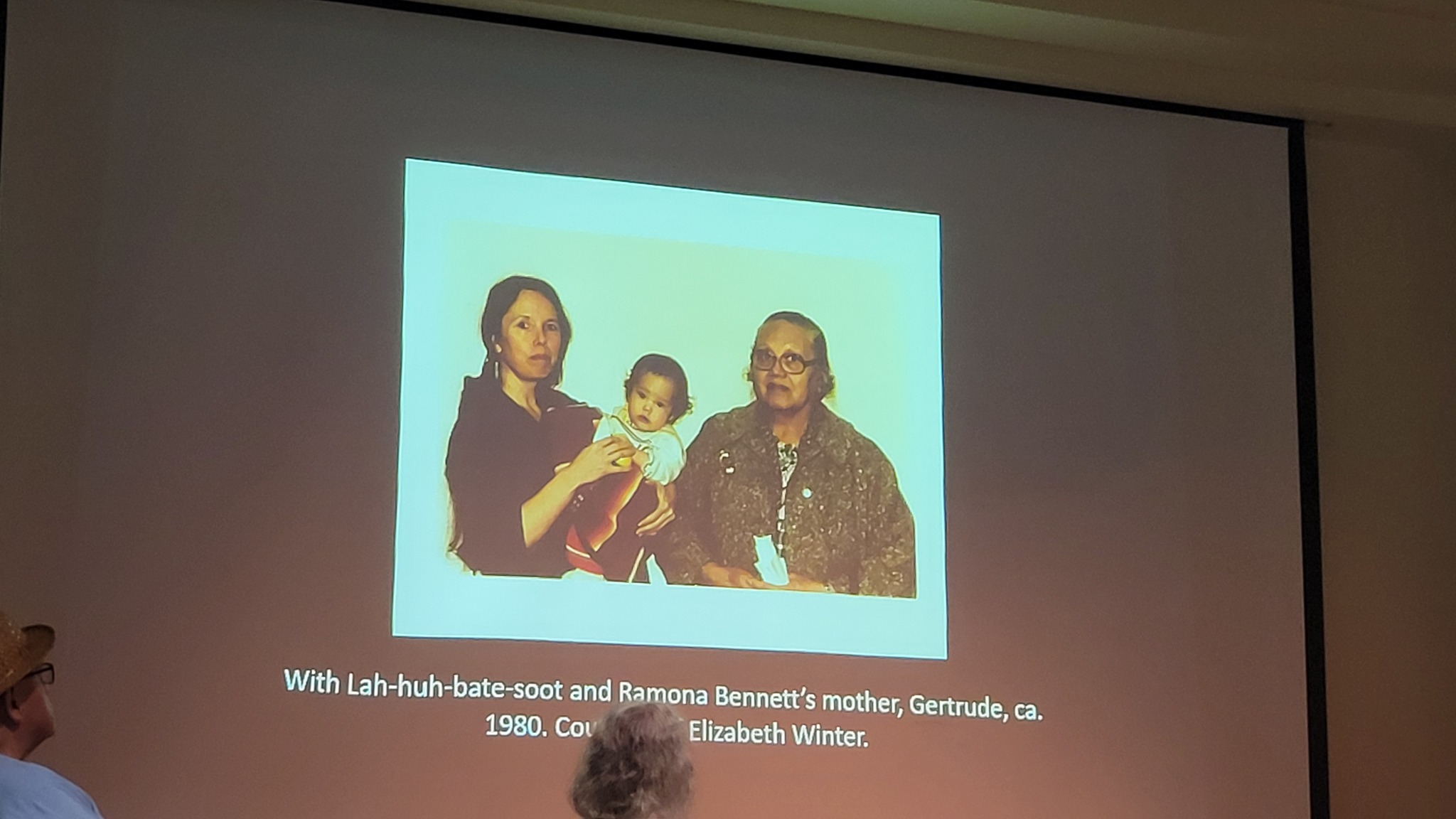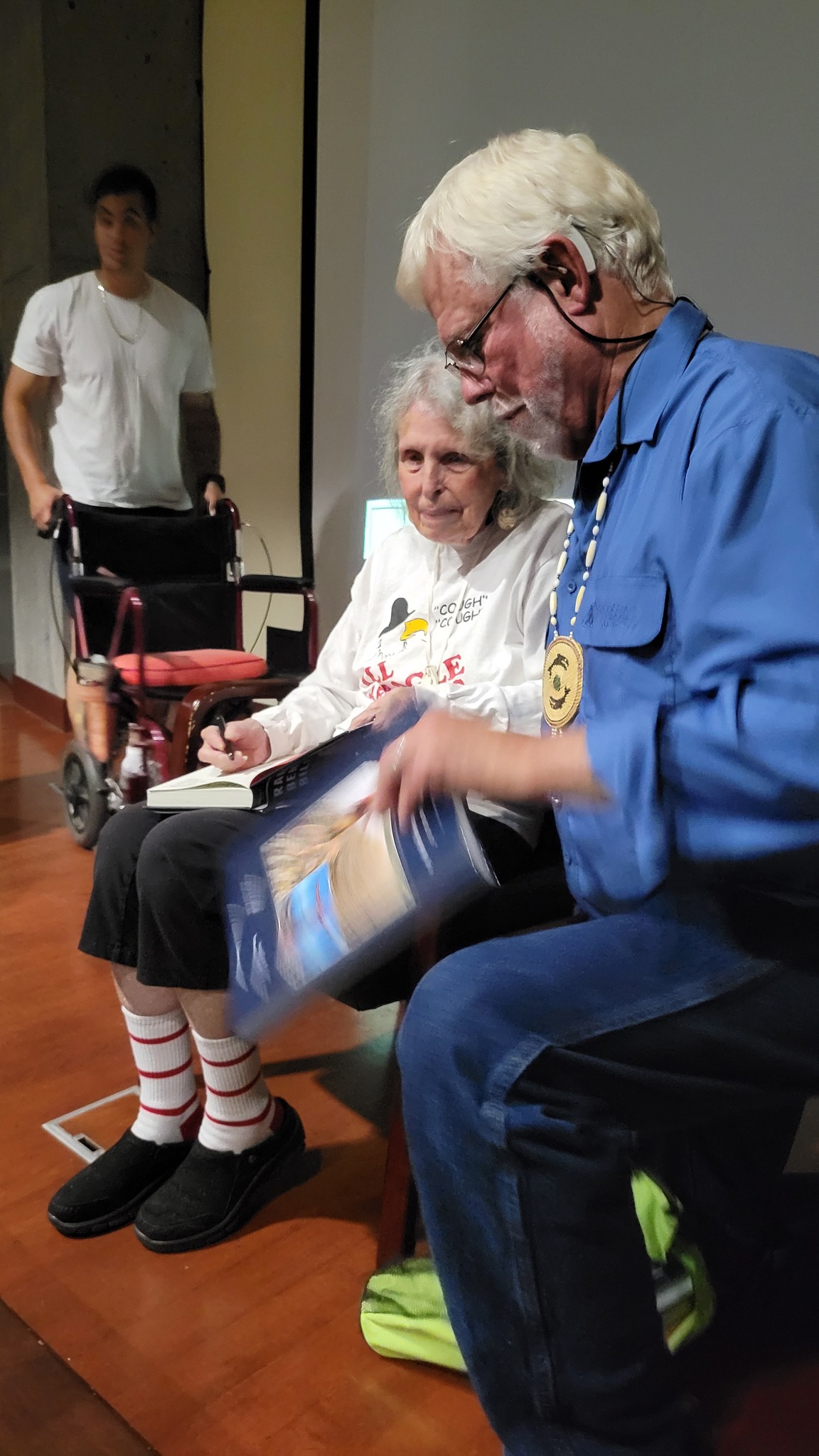 I walked in a little late, because I wasn’t off work in time for arrival. Center stage was Ramona Bennett Bill, now a frail 88-year-old, sitting in a chair with a large photo projected over her. She was flanked by John Hughes, chief historian for the Office of the Secretary of State and author of – Lightning Boldt – on her left and Darrell Hillaire on her right.