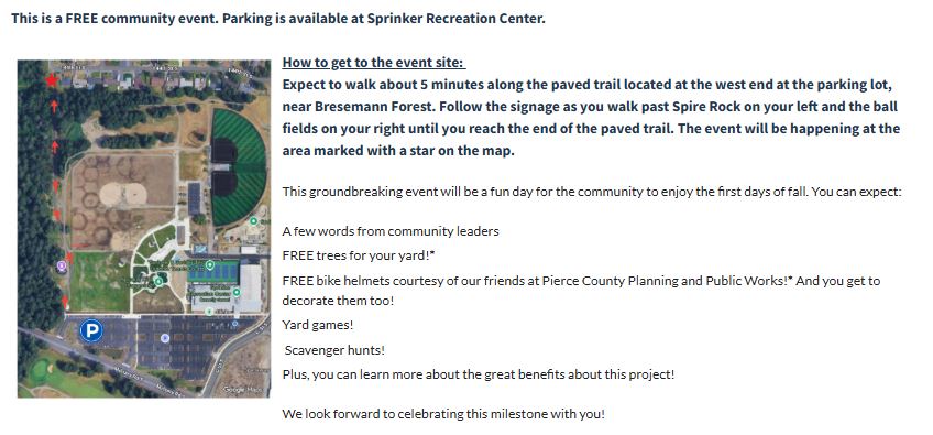 Pierce County Parks invites the community to the groundbreaking event of the new Parkland Community Trail on Saturday, Sept. 27 from 11 a.m. to 1 p.m.