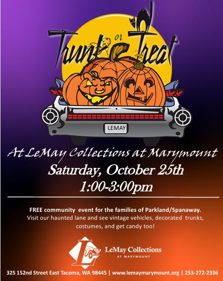 For families with kids: On October 25th, from 1:00 p.m. to 3:00 p.m., the Marymount site will be hosting the annual LeMay Trunk or Treat. Admission is free.