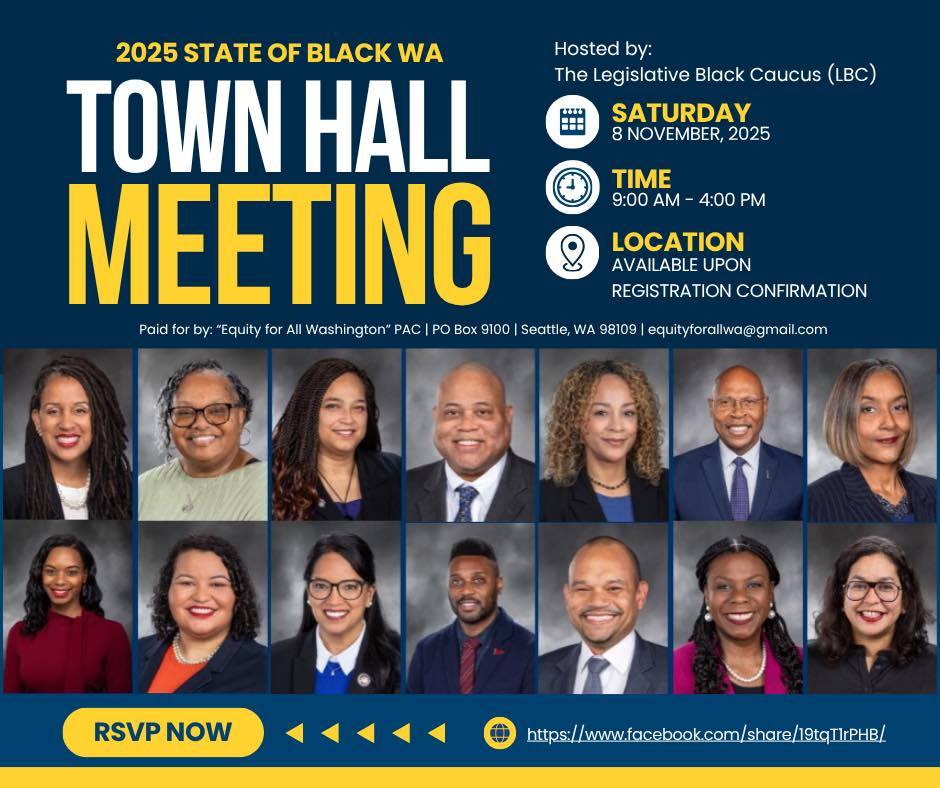 Please join the 2025 State of Black WA Town Hall Meeting hosted by the Legislative Black Caucus on Saturday, November 8, 2025, from 9 AM – 4 PM.