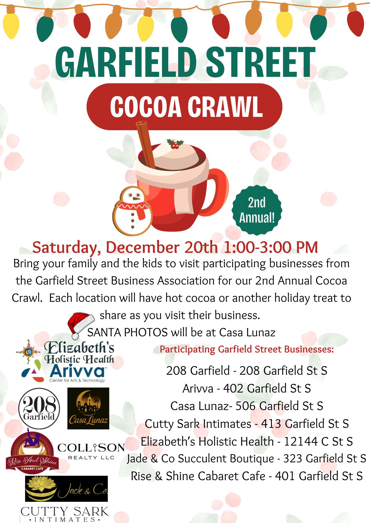 The second annual Garfield Street Cocoa Crawl will be December 20, 2025 in Parkland. The event is from 1 p.m. to 3 p.m. Several businesses will have candy canes, hot chocolate and possibly other treat for visitors.