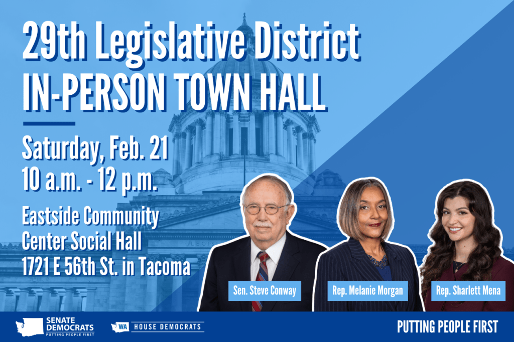 I’m excited to share with you that your 29th legislative district delegation will host a town hall on Saturday at the Eastside Community Center Social Hall in Tacoma. [10 am – Noon]
