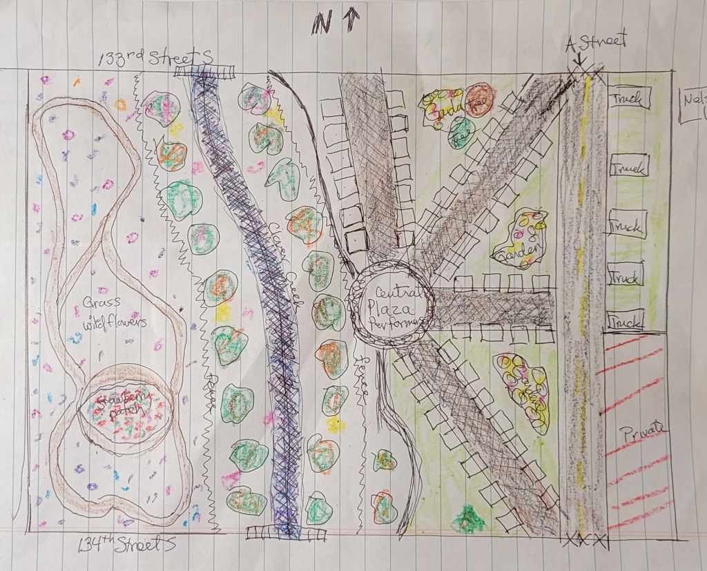 •On the east side, there will be a gravel sand mix set up as spoked trails with a central court area. This is for use as a community market – 10×10 pop up tents, artists, veggies, fruit, and other wares.