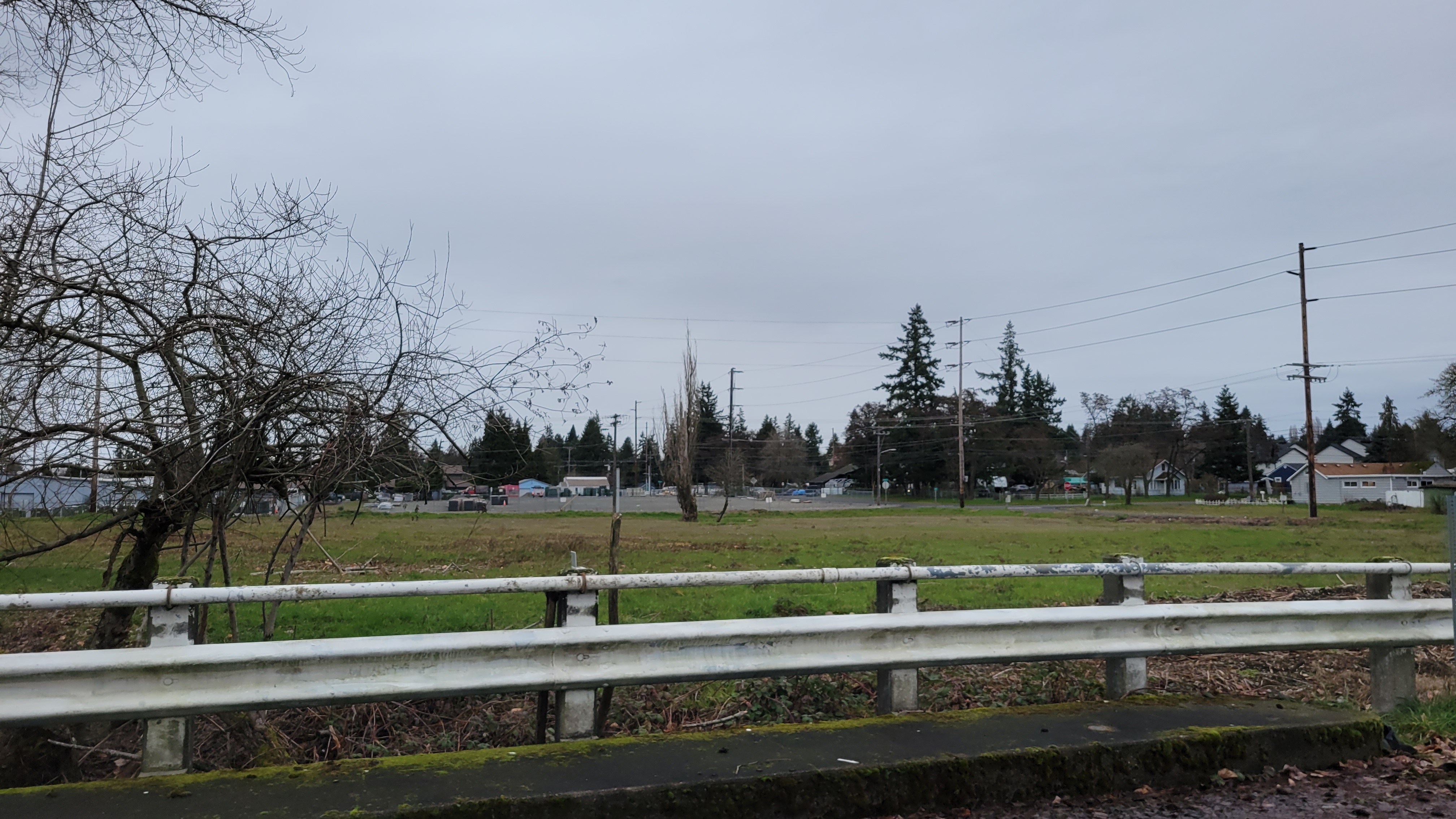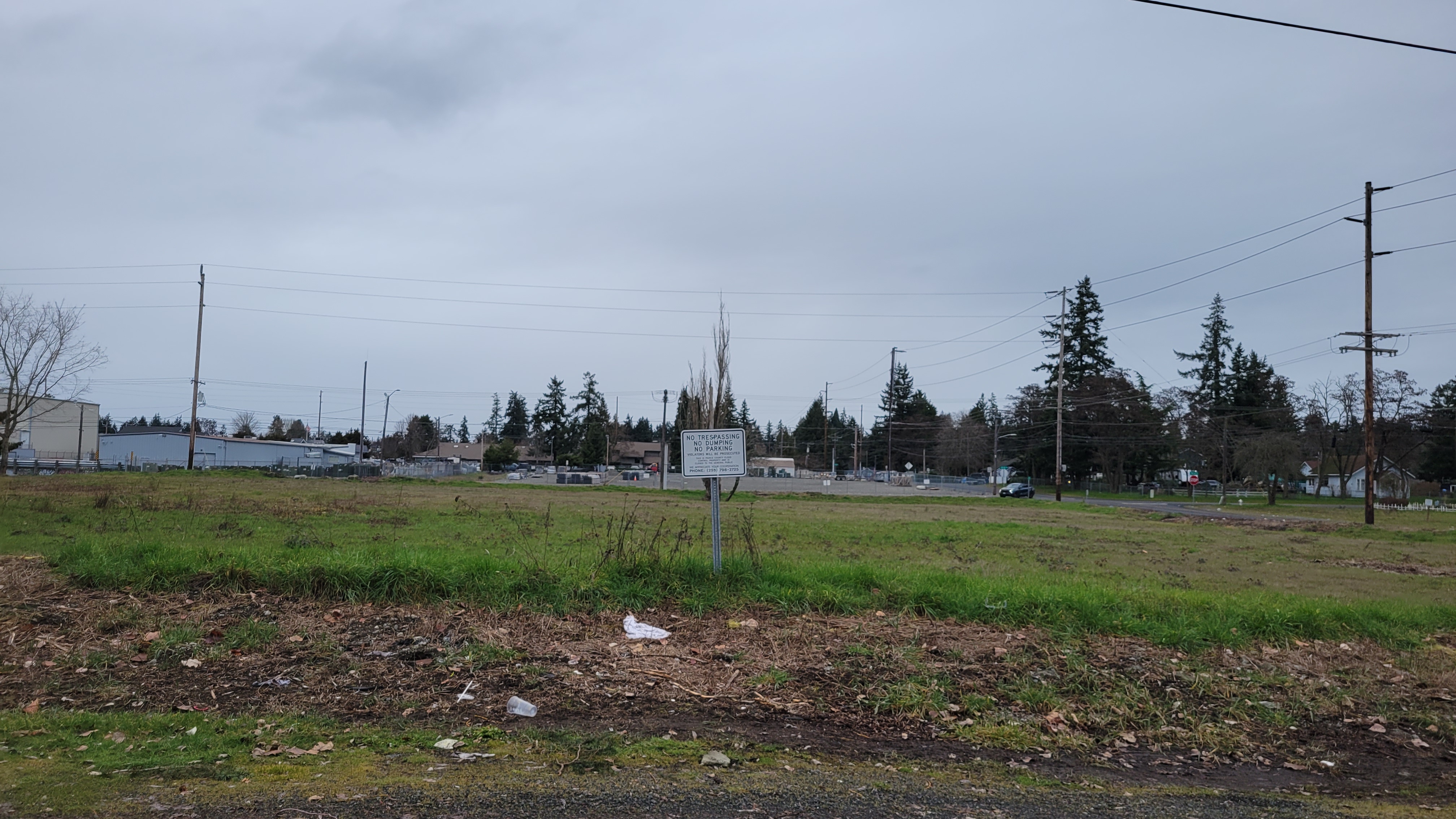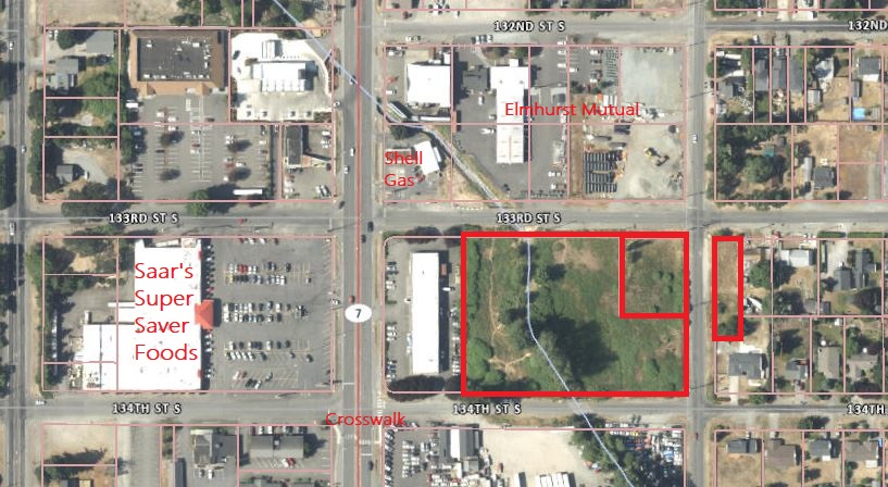 This is an aerial of the tree parcels that are involved. You can see how they are situated near Pacific Avenue with the new crosswalk at 134th Street South. Clover Creek flows through the middle of the largest lot. Together there is about 3.2 acres to make useful to the community in the summertime when it is dry. In the winter, this property can flood, so it is not usable for developments of other types.