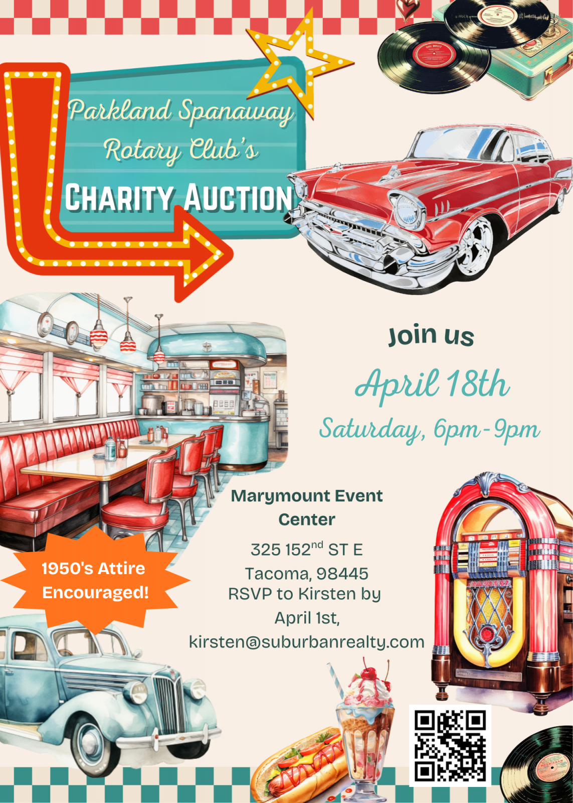 The event is April 18, 2026, from 6 to 9 p.m. 1950’s attire is suggested, but not mandatory. Have some pocket money ready if you want to win the best dessert, otherwise you can use credit or debit for auction items. Admission is an $80 donation.