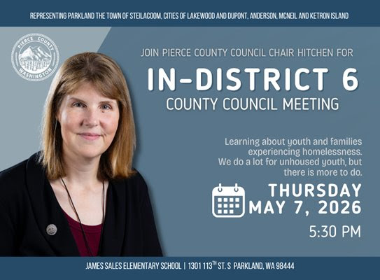Per our Pierce County Charter, each County Councilmember is required to hold one in-district meeting in the evening each year. May 7 will be the date for the 6th Council District meeting, beginning at 5:30 p.m. at James Sales Elementary, 1301 113th St S, Tacoma, WA 98444.